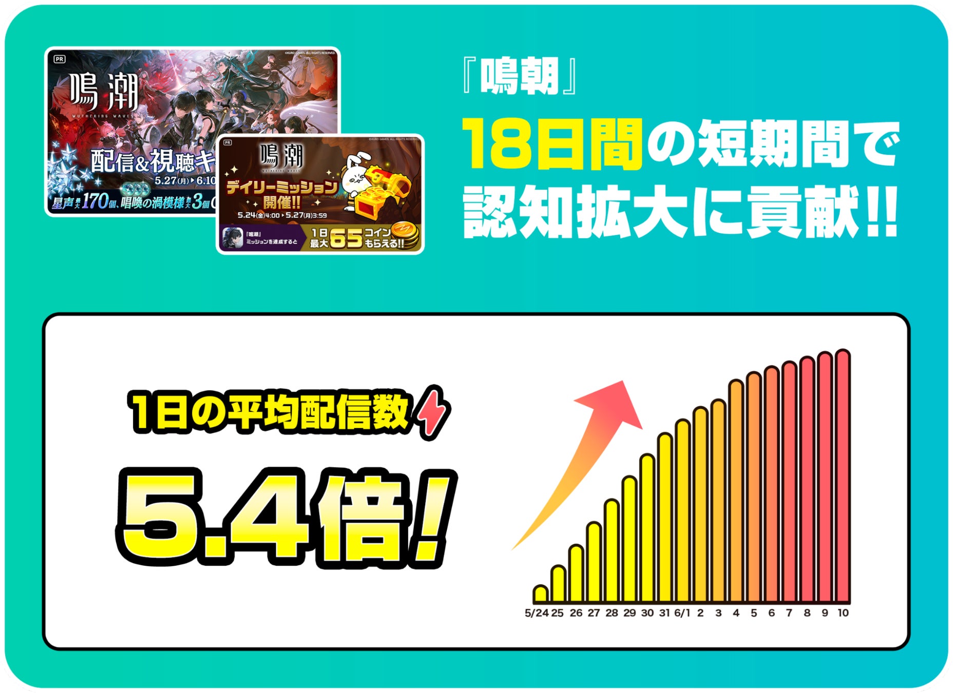 『鳴潮』のコミュニティ施策はリリース翌日の2024年5月24日(金)から開始しました。施策当日から多くの配信が行われ、リリース翌日からわずか18日間の施策でありながら、施策前と比較すると1日の平均配信数が5.4倍も成長しました。