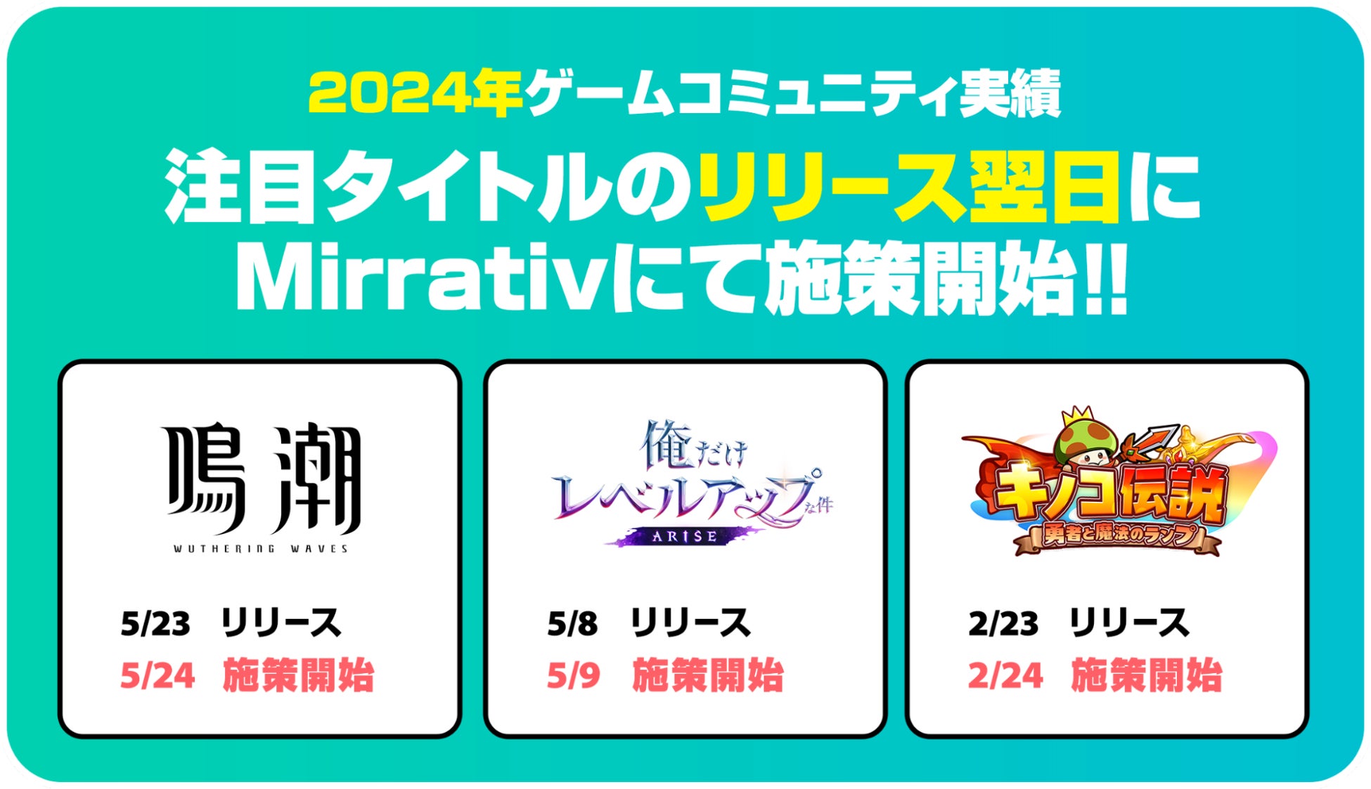 『鳴潮』『俺だけレベルアップな件:ARISE』『キノコ伝説:勇者と魔法のランプ』など、多数のゲームタイトルのリリース初期から認知拡大に貢献