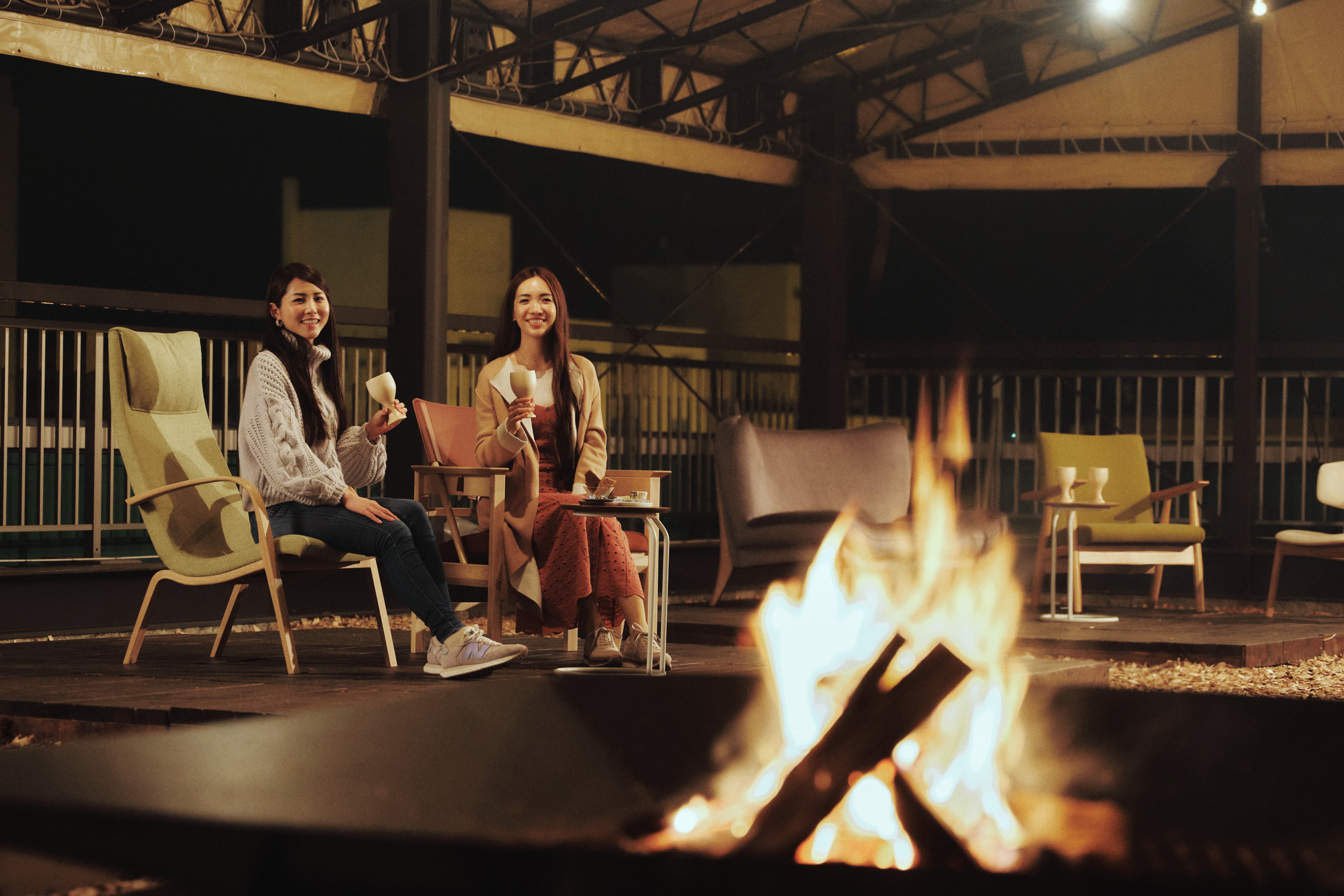 OMO7旭川5階の屋外スペースに焚き火を用意。本イベントの焚き火で使用する薪は、旭川家具の制作過程で出た廃材や間伐材。有効的に活用することで、質の高い無垢材を余すことなく堪能できます。さまざまな種類の木材を使用しているため、組み合わせによって異なる香りを体験できます。さらに今年は屋根のないエリアを増設。旭川の街並みや夜空を眺めながら焚き火を満喫できます。
