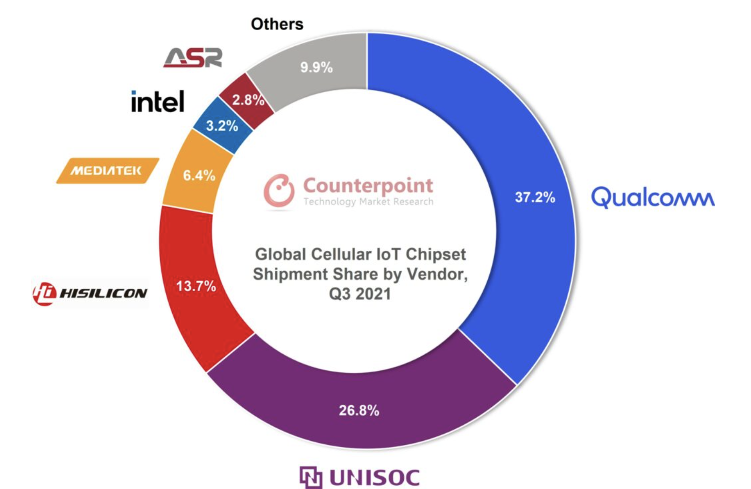 UNISOCは、世界第2位のセルラーIoTチップセットプロバイダーであり、4G Cat 1市場に関してはQualcommを抜いて首位となった。Cat 1は引き合いが増えてきており、UNISOCのシェアを押し上げている。UNISOCは4G Cat 1に加えて、NB-IoTと2Gにおいても、2021年第3四半期のリーダーとなった。この背景には、中国でモジュールの出荷が増えたこと、Huawei HiSiliconのシェア低下が寄与している。シェアが下がったとはいえ、HiSiliconは第3位のチップセットサプライヤーの地位を維持している。」