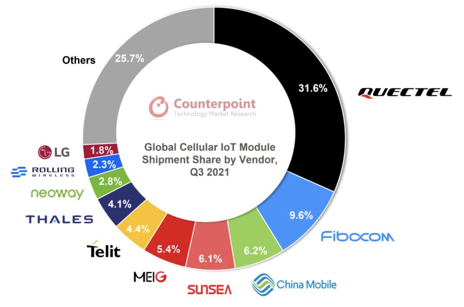 China Mobileはこの四半期にトップ3にランク入りした。2021年第3四半期の出荷は前年の3倍である。中国市場では、2Gや3Gモジュールが置き換えられるにつれ、NB-IoTと4G Cat 1モジュールの引き合いが高まるだろう。