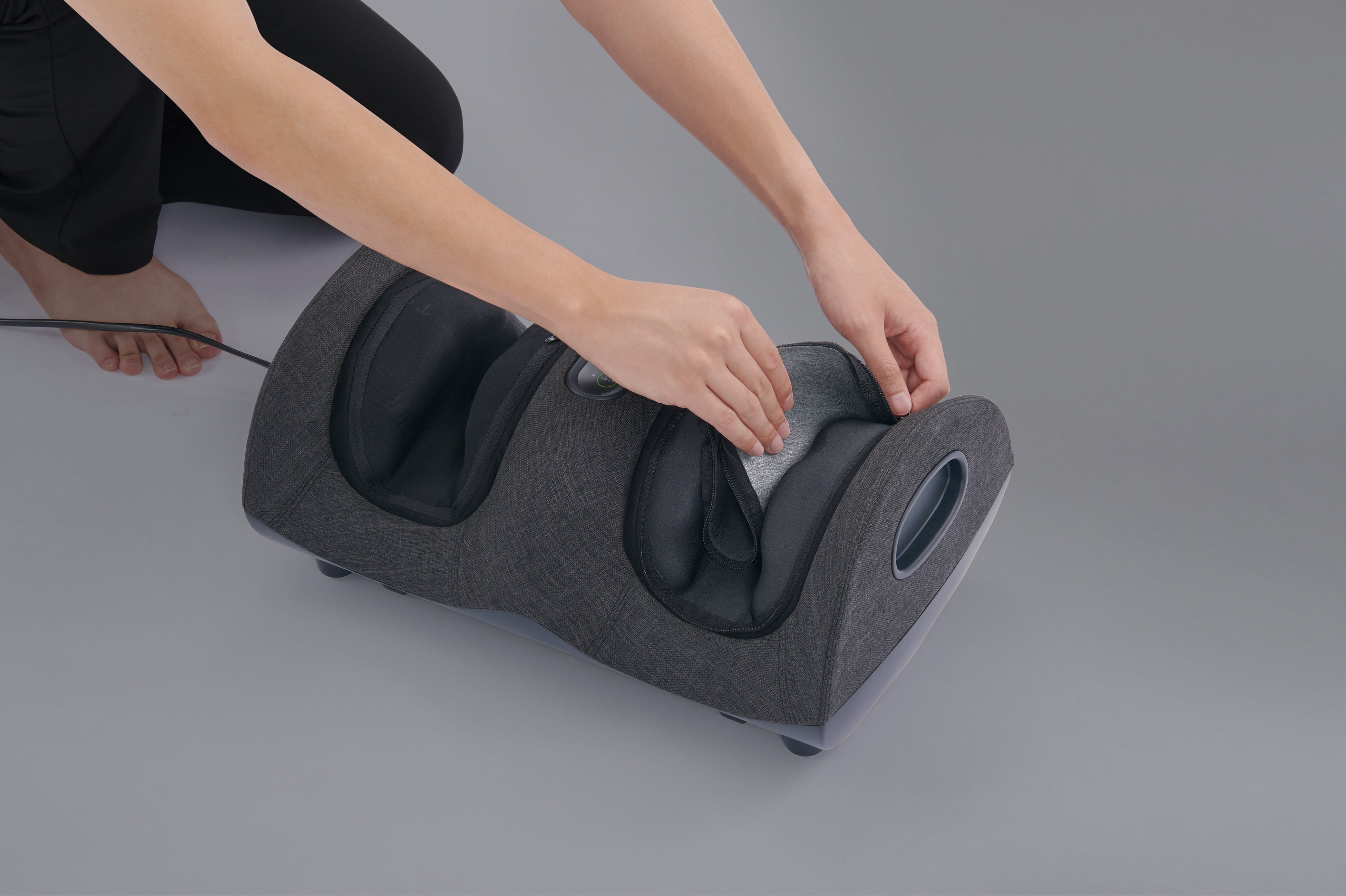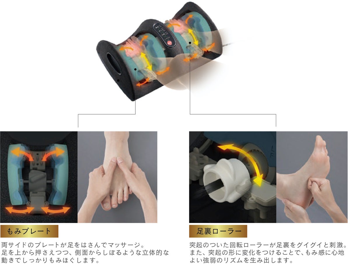 「もみプレート」と「足裏ローラー」を搭載し、疲れた足を2つの機構がしっかりはさんでもみほぐします。足先部分にはヒーターを内蔵し、温めながら心地良くマッサージできます。