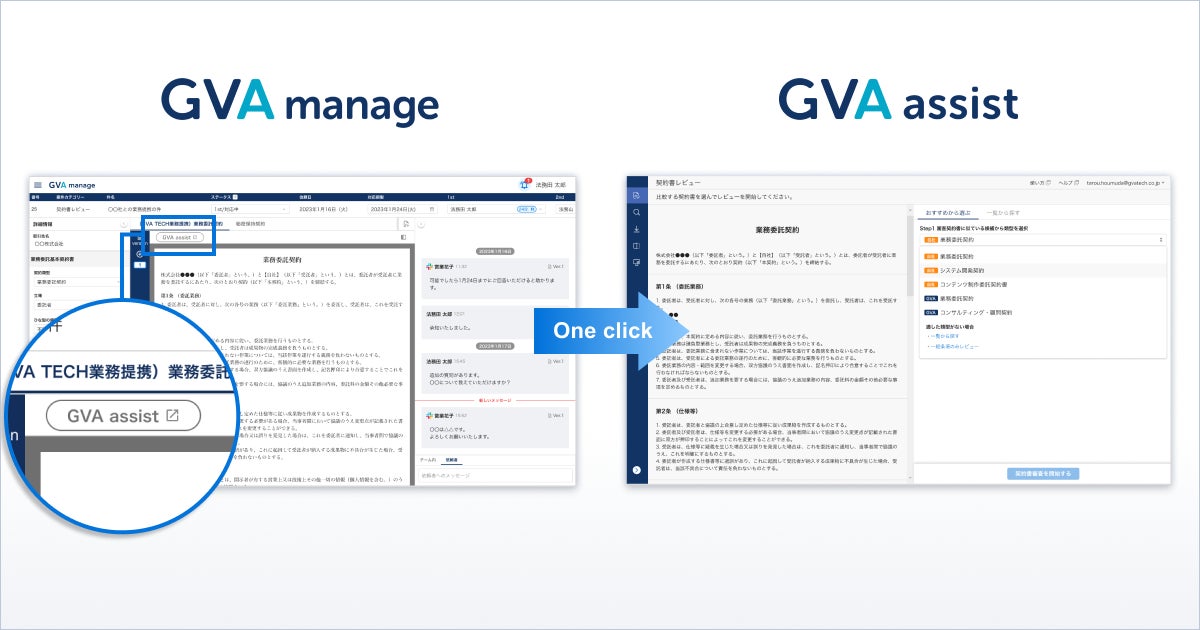 GVA TECH株式会社(本社:東京都渋谷区、代表取締役:山本 俊、以下GVA TECH)は、事業部の業務プロセスを変えずに法務案件の受付管理とナレッジマネジメントを実現する法務管理クラウド「GVA manage(ジーヴァ マネージ)」が、GVA TECHが提供するAI契約書レビュー支援クラウド「GVA assist(ジーヴァ アシスト)」とAPI連携したことをお知らせいたします。