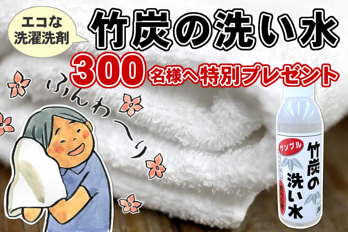 100%天然素材の洗濯洗剤「竹炭の洗い水」ミニボトル(25ml)を先着300名様に無料プレゼント!界面活性剤不使用で、肌や自然環境にも配慮した、柔軟剤不要の自然派洗剤は、部屋干しのニオイ対策にも最適!