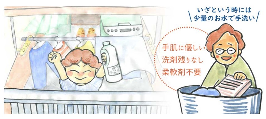 「竹炭の洗い水」は、国産の竹炭と竹炭灰を使い、界面活性剤や蛍光剤、柔軟剤、香料などを一切使用しない、肌にも環境にも配慮した自然派の洗濯洗剤です。洗い上がりは柔らかくふんわり仕上がるので、柔軟剤が不要。すすぎも1回で済むため、経済的でエコな洗濯アイテムとなります。特に、洗剤のすすぎ残しが気になる方や赤ちゃんの衣類へのご使用をおすすめいたします。部屋干し時のニオイ対策にも効果的で、殺菌力が高く、イヤなニオイをしっかりと取り除いてくれるので、忙しい方の部屋干しも快適になります。