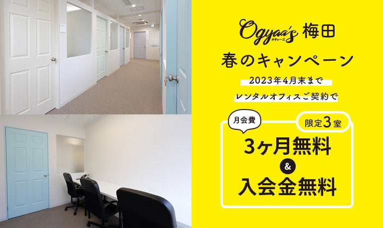 株式会社ツクリエ(本社:東京都千代田区 代表取締役:鈴木英樹 以下、ツクリエ)が運営する、大阪・梅田のオフィス&コワーキングスペース Ogyaa’s(オギャーズ)梅田は、「春のキャンペーン」として、2023年4月末までのレンタルオフィスのご契約を対象に、入会金&月会費3ヶ月分が無料になるキャンペーンを実施しています。