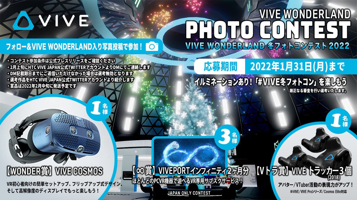 HTC NIPPON株式会社(東京都中央区、代表取締役社長:児島全克、以下HTC)は、本日1月14日(金)より、「VIVE Wonderland 冬フォトコンテスト2022」を開催いたします!HTC VIVE Japan公式Twitterアカウントをフォローし、VIVE Wonderland上で撮影した写真をツイッター上にハッシュタグ「#VIVE冬フォトコン」と一緒に投稿することでご参加になれます。HTC VIVE Cosmos、VIVEトラッカーセット、VIVEPORTインフィニティなど、素敵なVIVE賞品が当たります。みんなの写真でVIVE Wonderlandを盛り上げましょう!