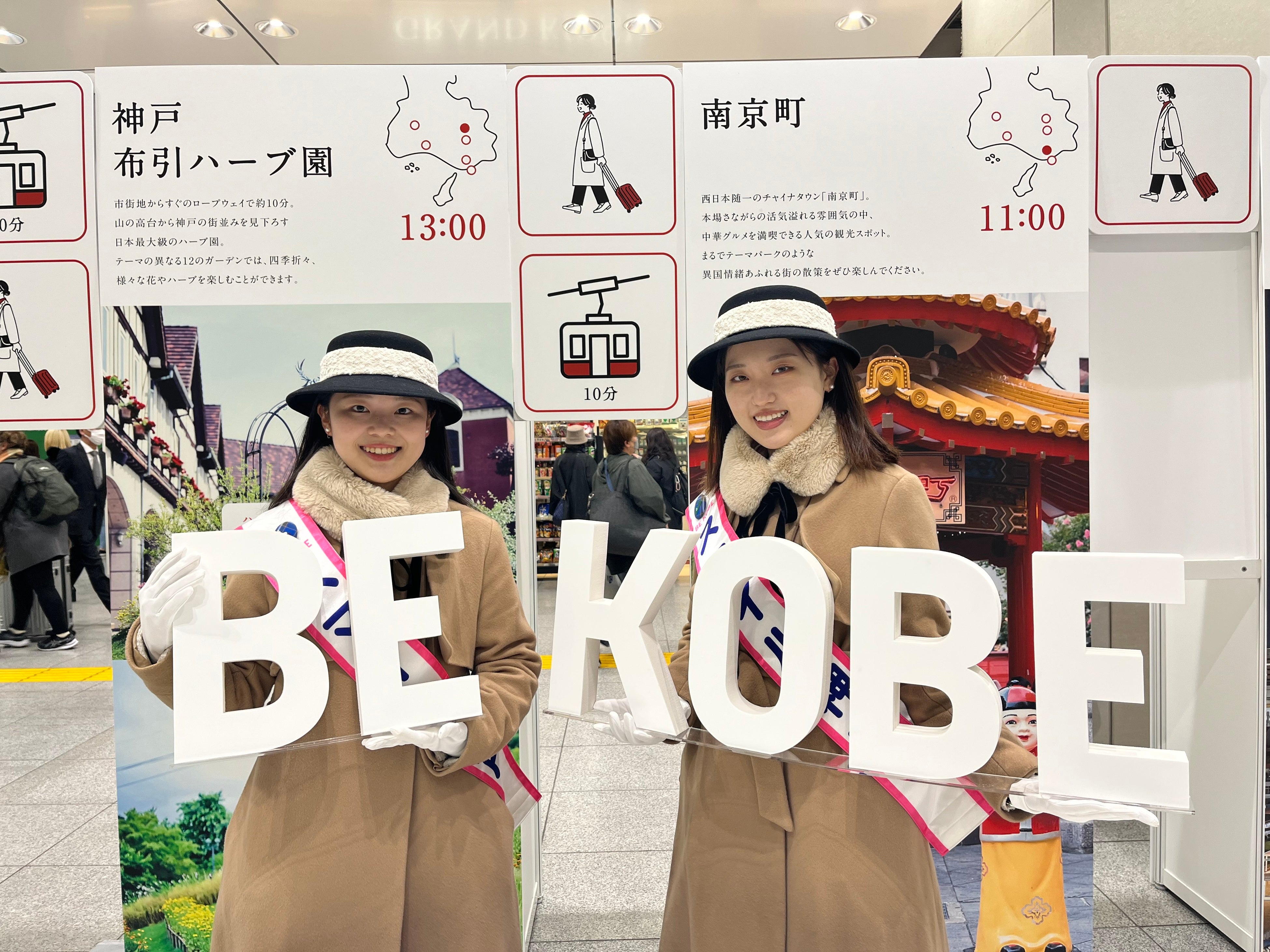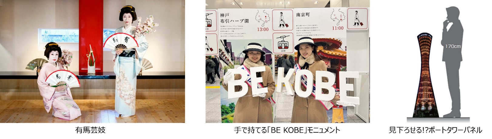 神戸タータンで装飾したJR品川駅中央改札内のイベントスペースでは、神戸観光や、神戸空港のPRに加えて神戸スイーツや灘五郷の日本酒といった、神戸の名産品を集めた物販も実施します。さらに、神戸の定番観光スポット「BE KOBE」のミニモニュメントや、ポートタワーパネル等の、フォトスポットもご用意しており、有馬芸妓や、観光親善大使との記念撮影もお楽しみいただけます。