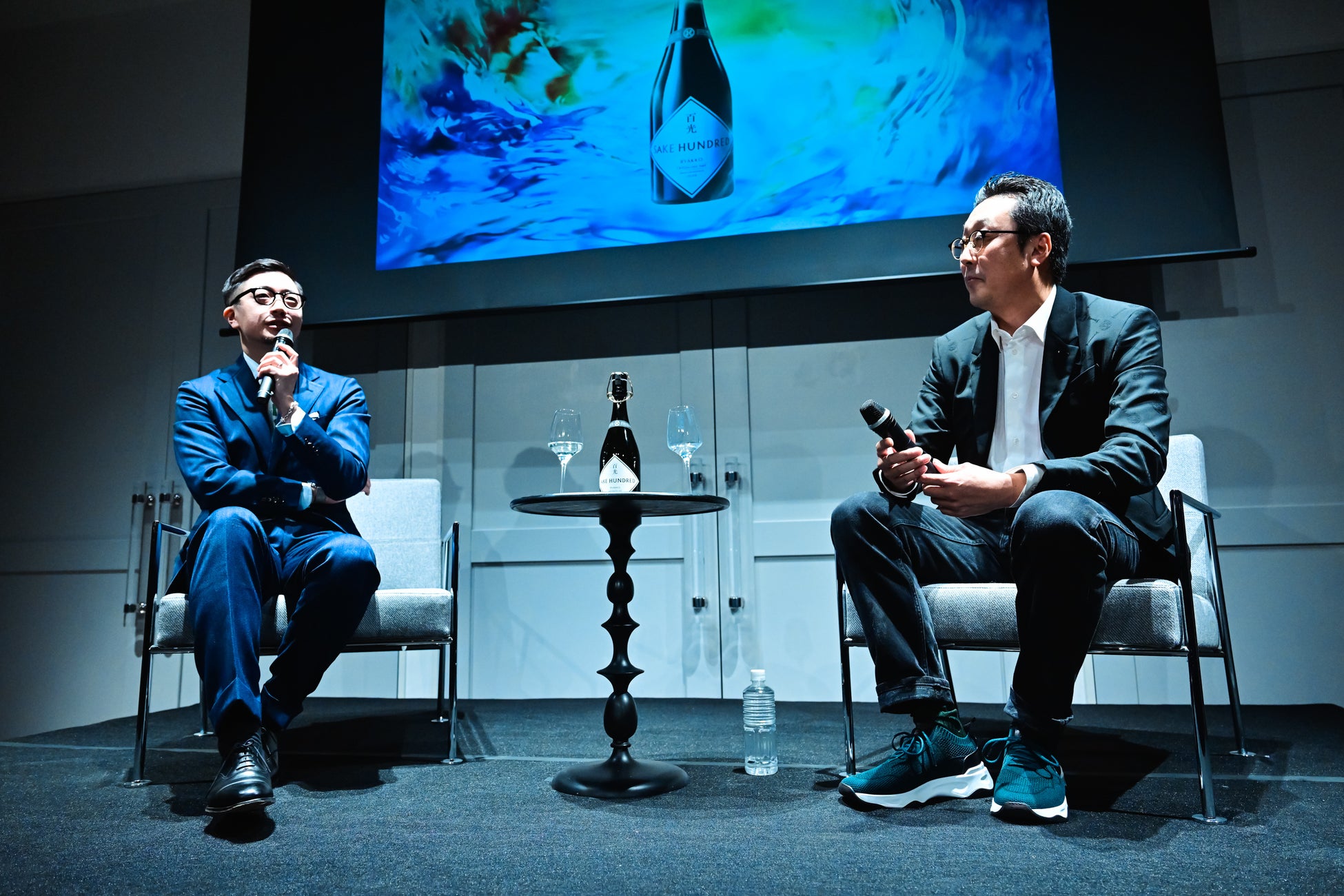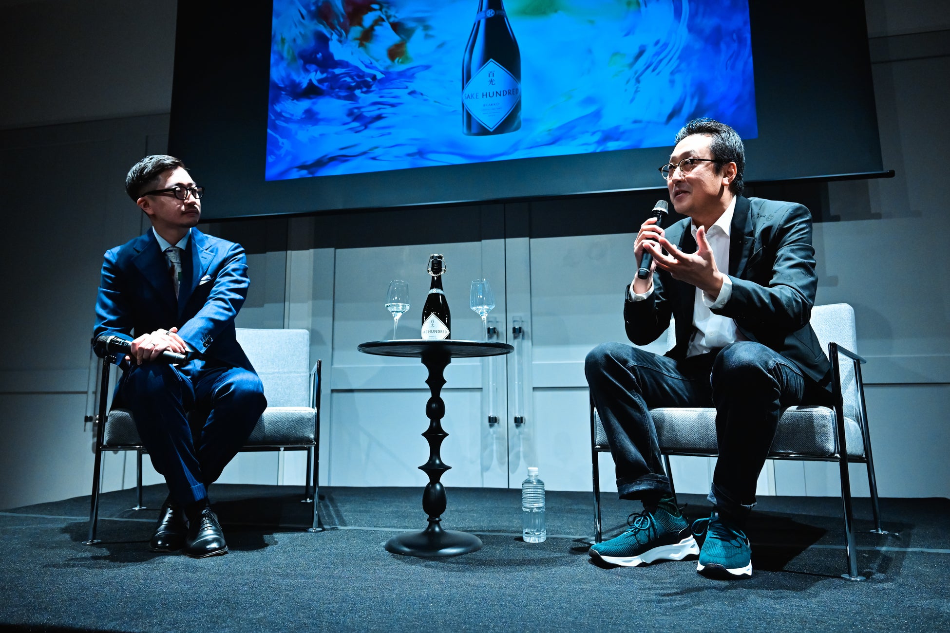 パーティー中盤では、『百光』の醸造パートナーである楯の川酒造(山形県)の6代目蔵元・佐藤淳平氏が生駒とともに登壇。新しい酒米「雪女神」の特性など醸造現場ならではリアルな話が聞かれ、新たな『百光』を体験したばかりのお客様の感動をさらに高めました。また、日本酒のみならず「日本の産業全体としてグローバルに向けて高付加価値を展開していくべき」という、より高い視座に立った課題と可能性など、楯の川酒造とSAKE HUNDREDが共に取り組む未来についても語られました。