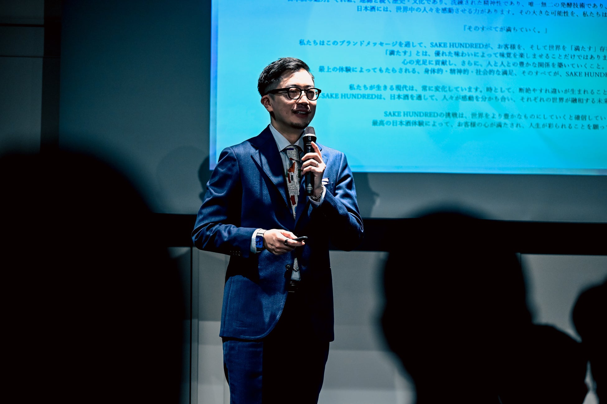 イベントの冒頭では、株式会社Clear代表取締役CEO兼ブランドオーナー 生駒龍史から、2018年に誕生してから今日までの『百光』の軌跡が紹介されました。中国やフランス、アメリカで実施されたVIPイベントでの商品提供、各年のブランドメッセージやペアリングディナーなどの独自の取り組み、酵母のブレンドやオリジナル種麹の開発などの製造における挑戦にいたるまでを紹介。『百光』に対する期待が高まった後に、新しい『百光』で乾杯が行われました。