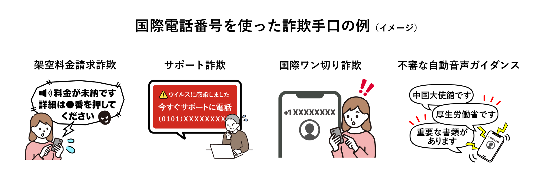 国際電話番号を使用した詐欺の手口は多様化しています。実在する企業を装い架空の未納料金等の支払いを求める「架空料金請求詐欺」のほか、インターネット上に表示した偽警告から偽のサポート窓口に電話するよう誘導する「サポート詐欺」、着信履歴を残し折り返し電話をさせることで発生する通話料金を狙う「国際ワン切り詐欺」などが発生しています。そのほか、企業や官公庁をかたる自動音声ガイダンスを流す不審電話も発生しています。