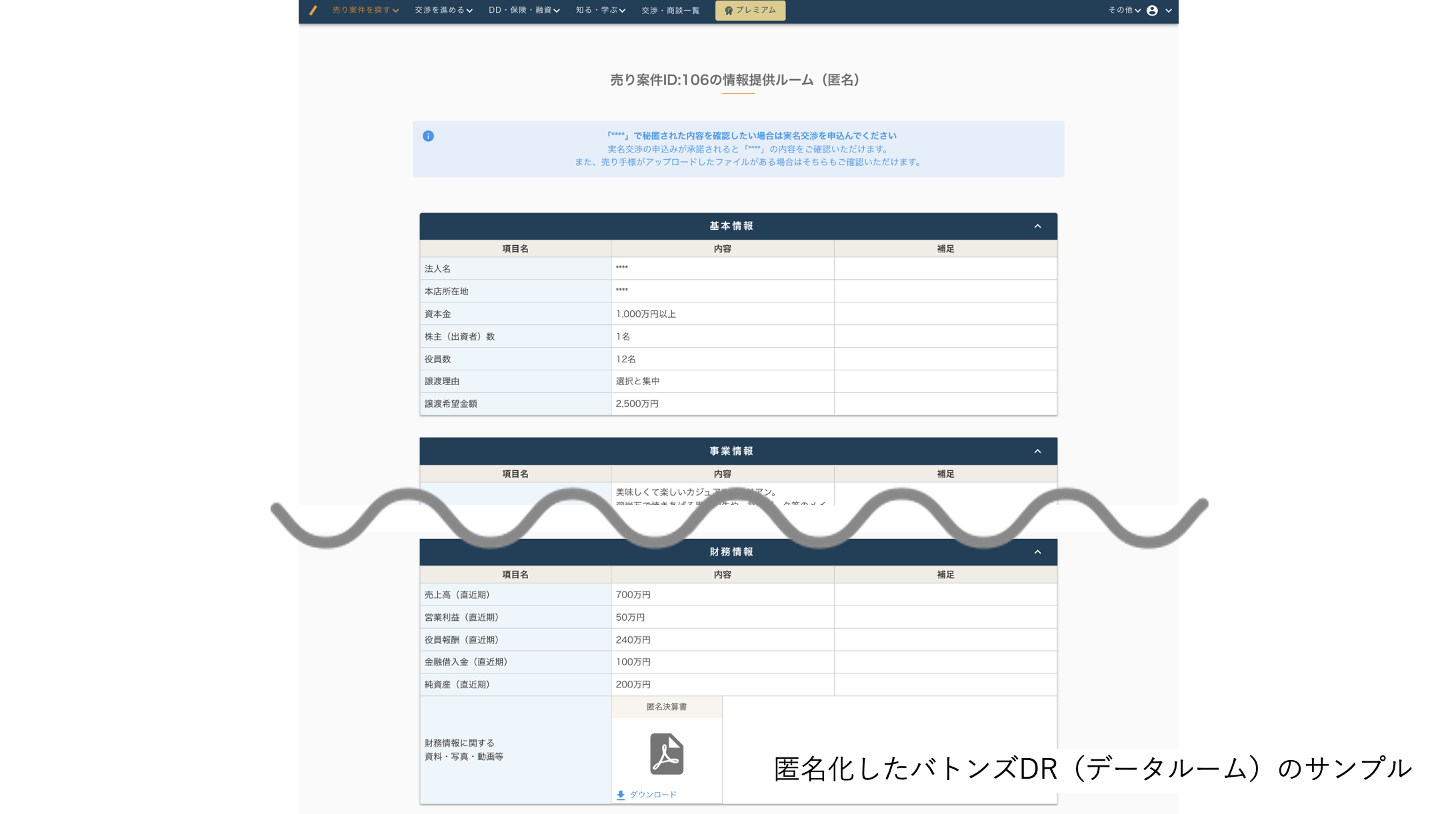 マッチング前に匿名化した「バトンズDR(データルーム)」を公開することで、買い手は希望する条件にあった案件のみにマッチングをすることができ、売り手は数多くの買い手からの質問に答えたり、交渉に至らない可能性のある買い手とマッチングすることを防ぐことができますので、より効率的にM&Aを進めることができます。