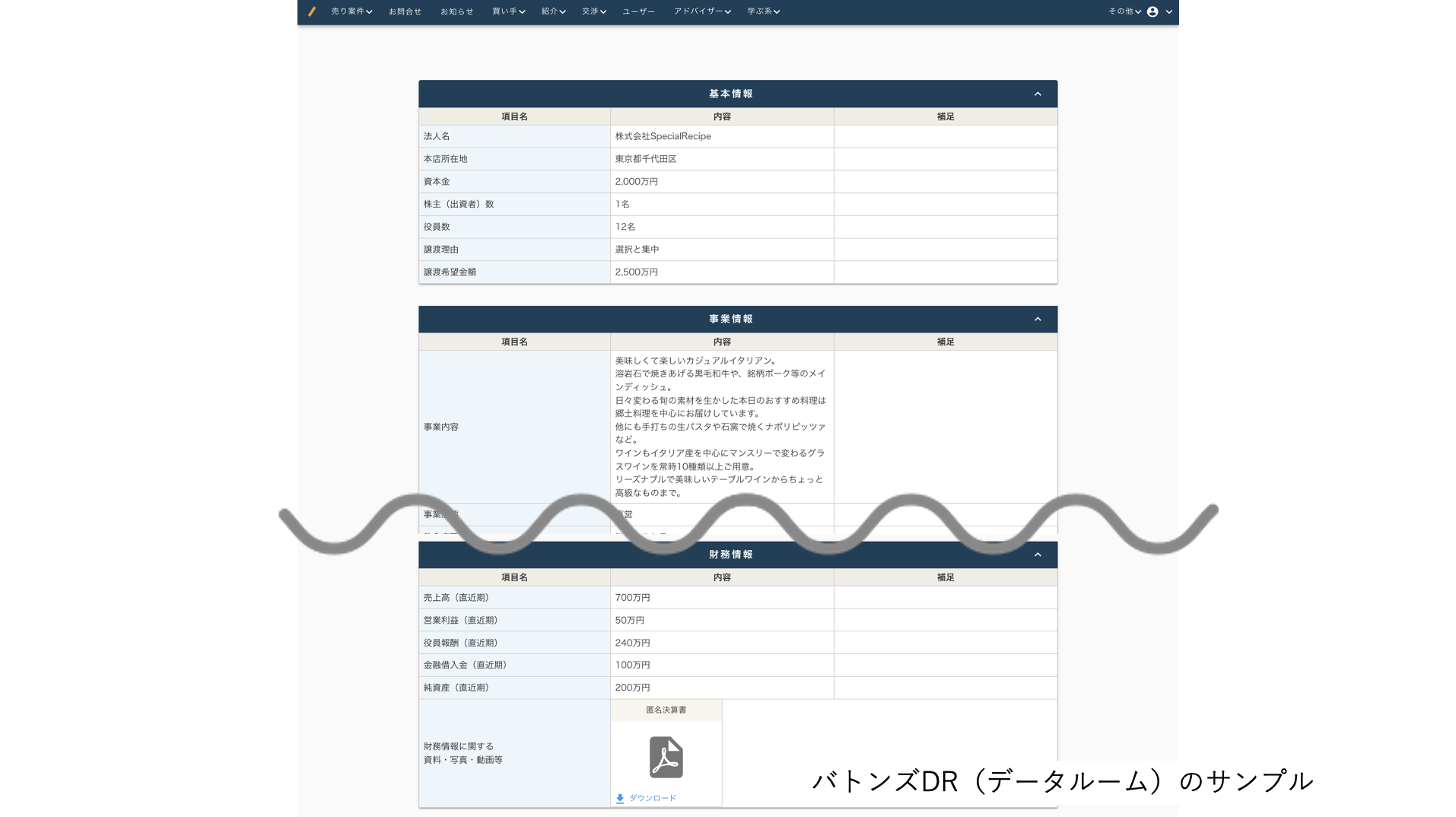 企業概要書は、これまでM&Aアドバイザーが何時間もかけてあらゆる資料を取り寄せて作成するものでした。しかし、情報提供ルーム「バトンズDR(データルーム)」では、40種類の業種別テンプレートを用意しており、M&Aアドバイザーが作成するものと極めて近い情報が含まれた資料をWeb上へ登録することができます。