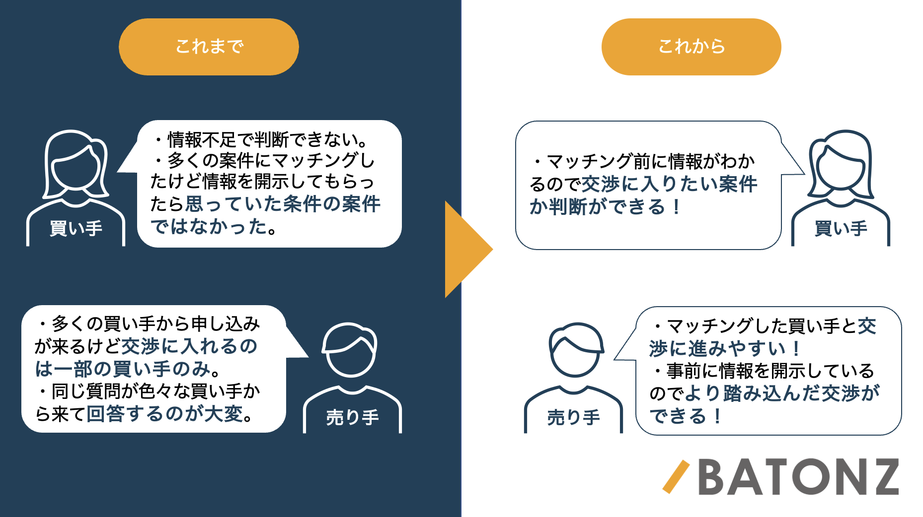 買い手はマッチング前の情報不足により案件を検討しづらく、またマッチングして詳細な情報が分かった後に探している条件に合致しなかったことが発覚するなどの多くの手間がかかっていました。売り手は多くの買い手からマッチングの申し込みを受けても、会社の詳細を公開したところで条件が合わず交渉に進めないことがあり、また様々な買い手から同じ質問を受けることで回答に多くの手間と時間がかかっていました。