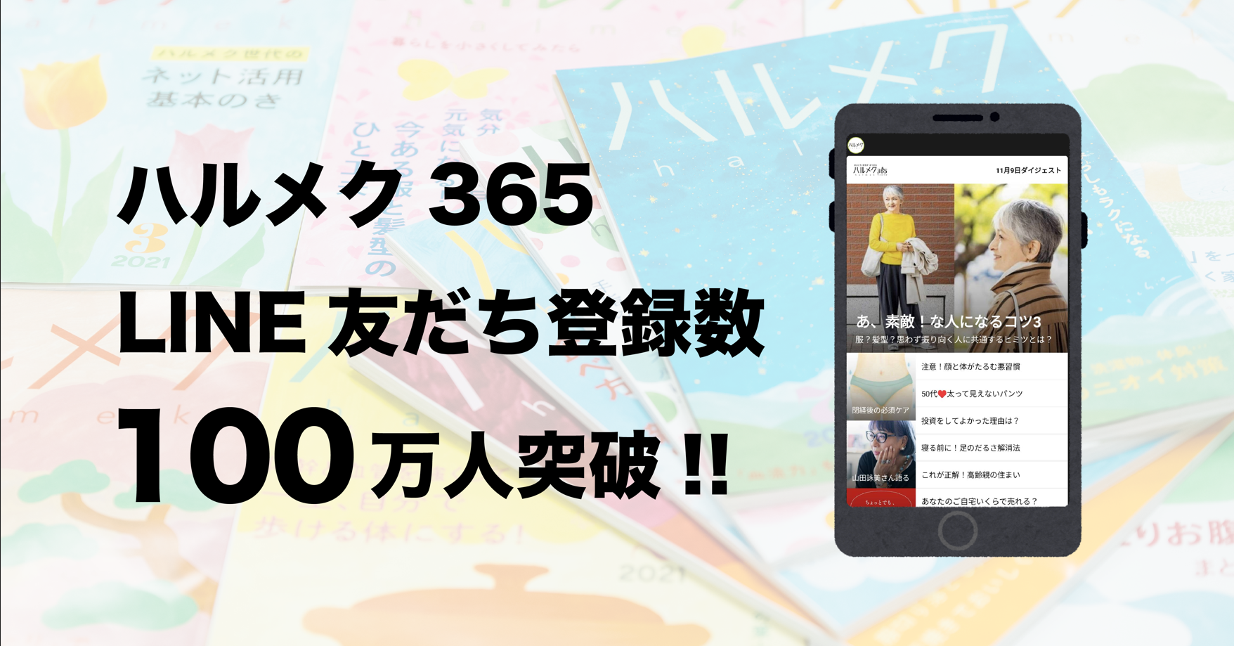株式会社ハルメク(本社:東京都新宿区、代表取締役社長:宮澤 孝夫)は、女性誌販売部数No.1(※1)の雑誌「ハルメク」のLINEアカウントメディアの累計登録者数が100万人を突破したことをお知らせいたします。