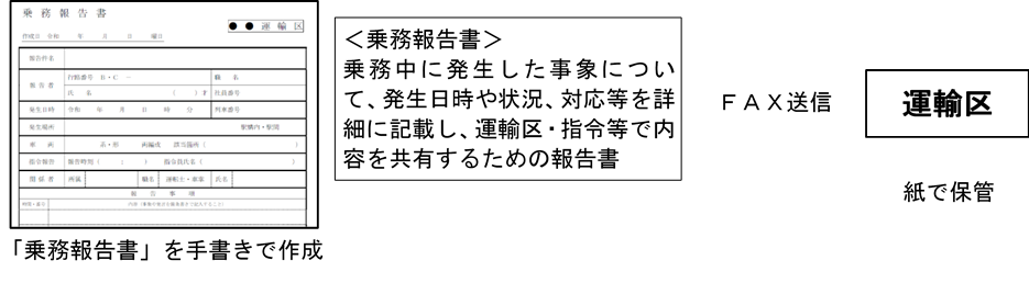 本アプリの活用により、大幅なペーパレス化に加え、乗務報告書作成時間の短縮が可能となるほか、報告内容の一部を定型化することにより、記載誤りの防止や承認行為の時間短縮等にも貢献します。