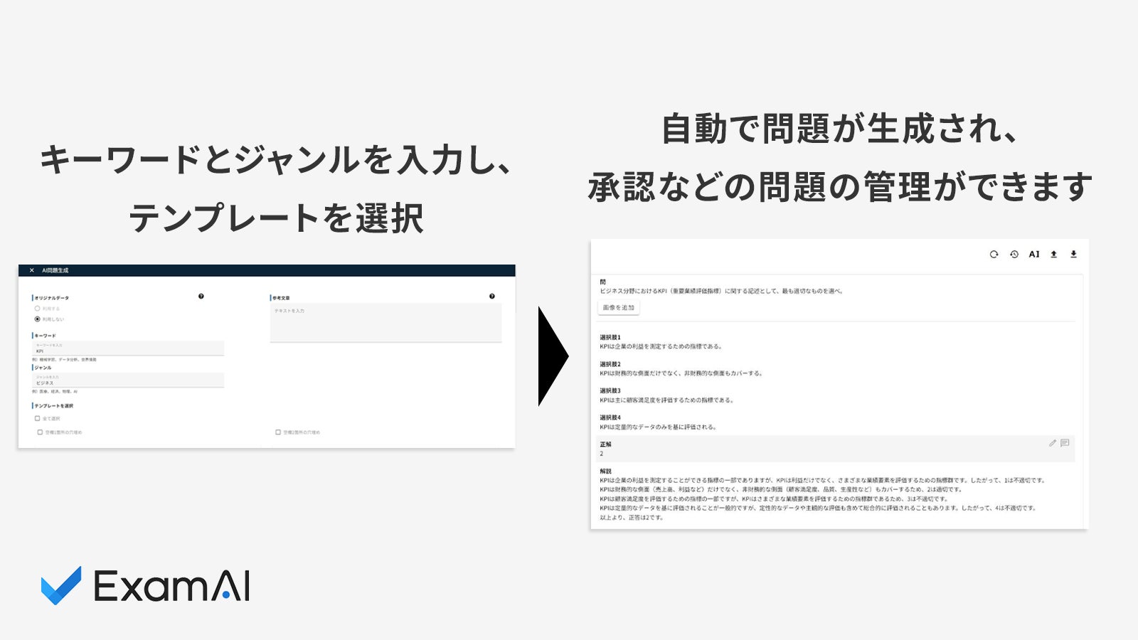 ExamAIは、民間企業が実施する検定試験、予備校の模擬試験、企業の昇進試験などの幅広い問題の作成支援から、作成した問題の保守管理までを行うことができるツールです。生成AIの技術を取り入れ、作問時間の軽減や問題の一元管理、複数人作業による表記ゆれの解消が可能です。対象とする試験等に即したオリジナルのデータベースやカスタマイズされたテンプレートを導入することで、それぞれの試験に応じた問題作成支援を実現します。