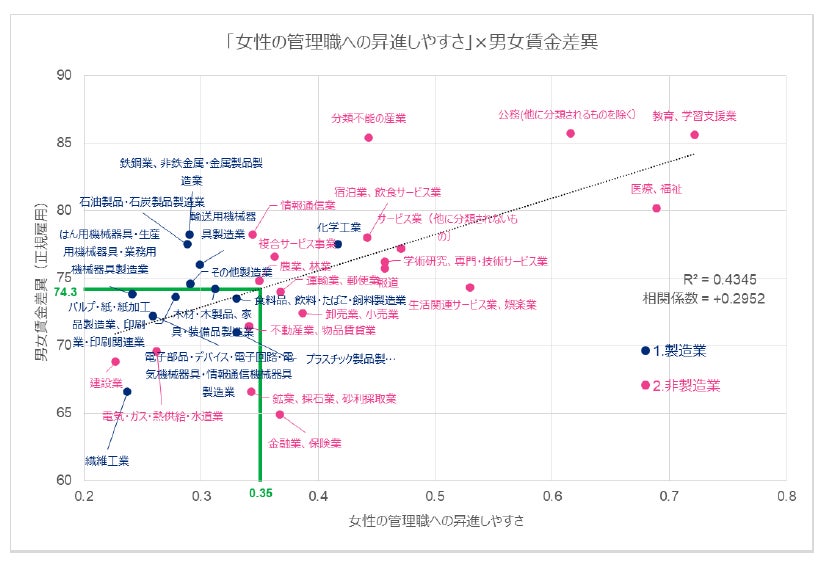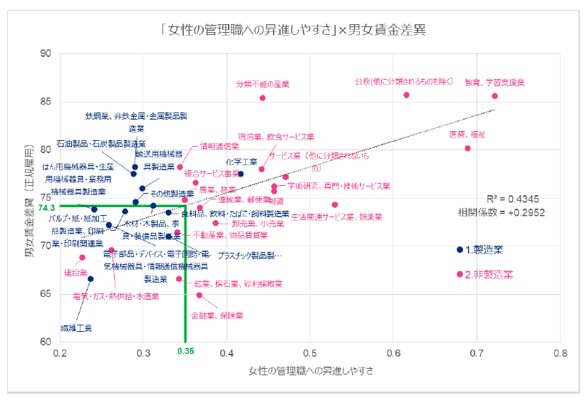 全体として、男性と女性の管理職への昇進しやすさが同等な業種では、男女の賃金差異も小さくなる傾向があります。一方、 男女の賃金差異が74%(全企業平均)の時、女性の管理職への昇進しやすさは男性の0.35倍です。これは、男女同数の従業員がいても、その中で管理職になっている女性の数は男性の35%にとどまっていることを示します。
