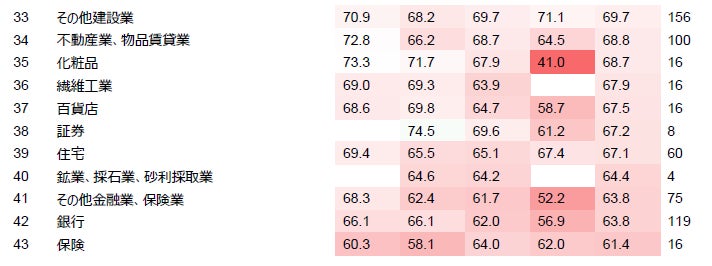 企業規模別では、企業規模が小さくなるほど男女の賃金差異が縮小する傾向がみられました。この傾向には様々な要因が考えられますが、日系企業が海外企業に比して女性活躍推進の遅れを指摘される中、公表データの小規模企業として多くの外資系日本法人データが含まれていることが、小規模企業における賃金差異の縮小に影響を与えている可能性があります。