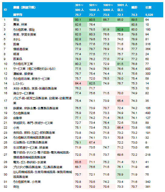 2023年7月6日現在、厚生労働省のデータベースに男女の賃金差異情報を公表している正社員301人以上の企業は5,520社でした。正規雇用従業員における男女の賃金差異の業種別・規模別を集計したところ、全企業平均では女性賃金は男性賃金の74%にとどまっていました。