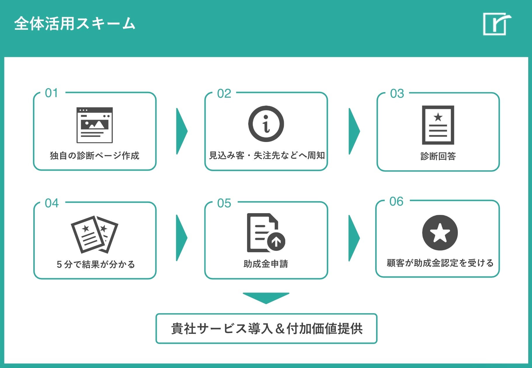 つまり「助成金診断」から「申請」まで事業者様の自社商品サービスとして、提供することが可能。「コスト削減」「時間短縮」だけでなく、新たな販路拡大などの付加価値を提供します。