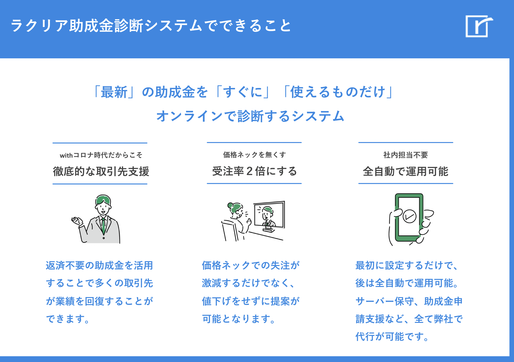 ぜひとも「ラクリア助成金診断システム」の導入を検討ください。
