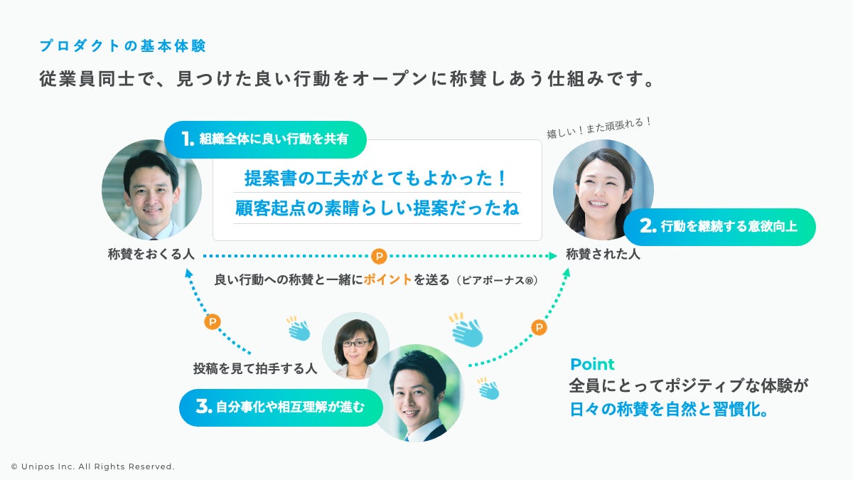 Uniposは、ピアボーナス®を軸とする全社参加型カルチャープラットフォームです。