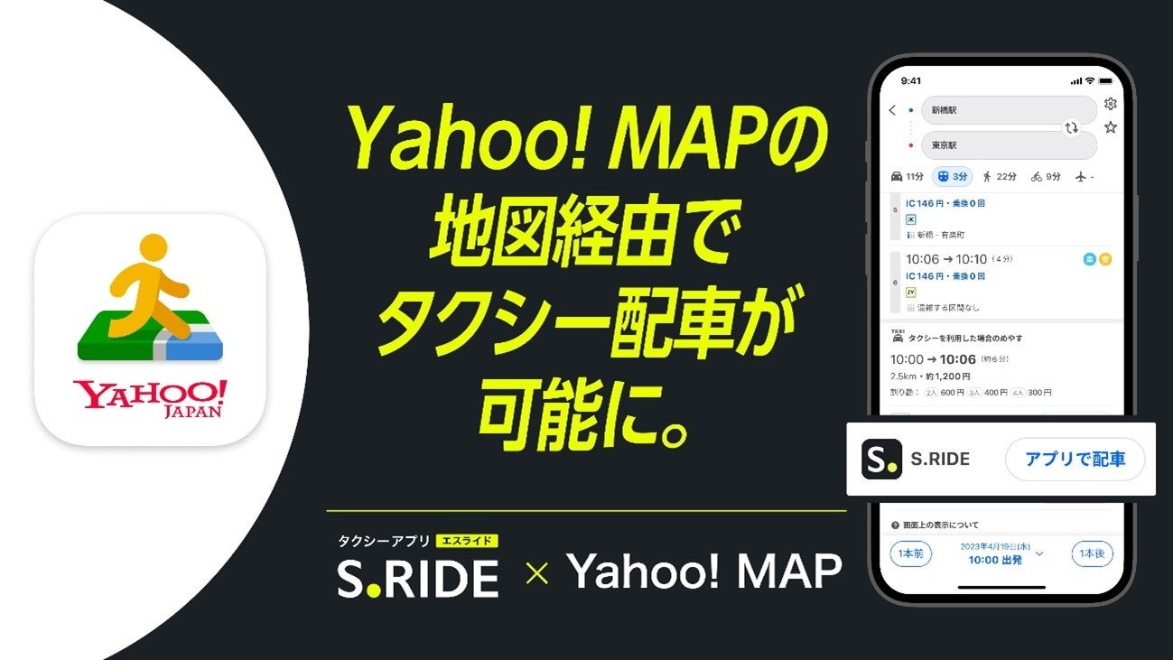 S.RIDE株式会社(本社:東京都港区、代表取締役:西浦賢治、以下S.RIDE) は、ヤフー株式会社と連携し、無料で地図が利用できる「Yahoo! MAP」アプリとタクシーアプリ 「S.RIDE」のアプリ連携を2023年4月19日(水)より開始いたします。
