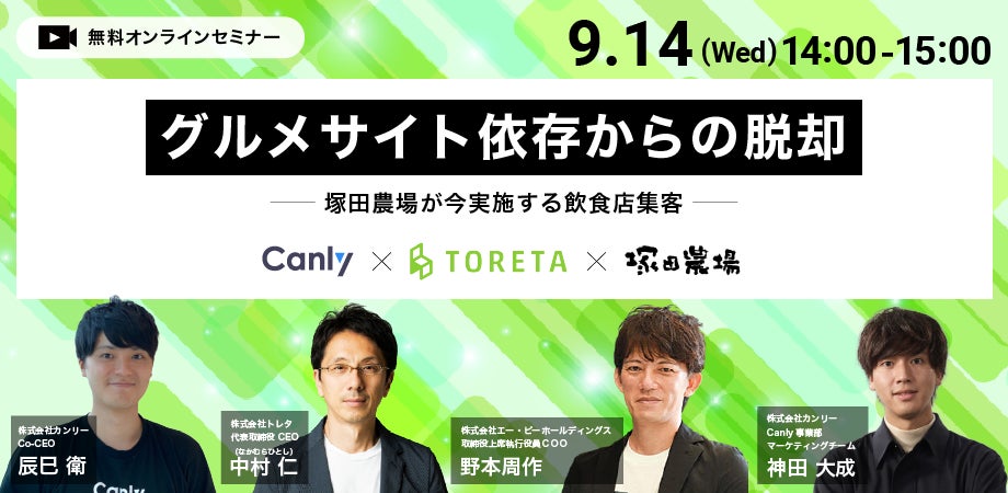 Googleビジネスプロフィール(旧・Googleマイビジネス)・HP・各SNSの一括管理サービス「Canly(カンリー)」の開発・提供を行う株式会社カンリー(所在地:東京都渋谷区、代表取締役:辰巳 衛,秋山 祐太朗)は、2022年9月14日(水)に株式会社トレタとの共催ウェビナー【グルメサイト依存からの脱却】塚田農場が今実施する飲食店集客 を開催することとなりましたのでご案内いたします。