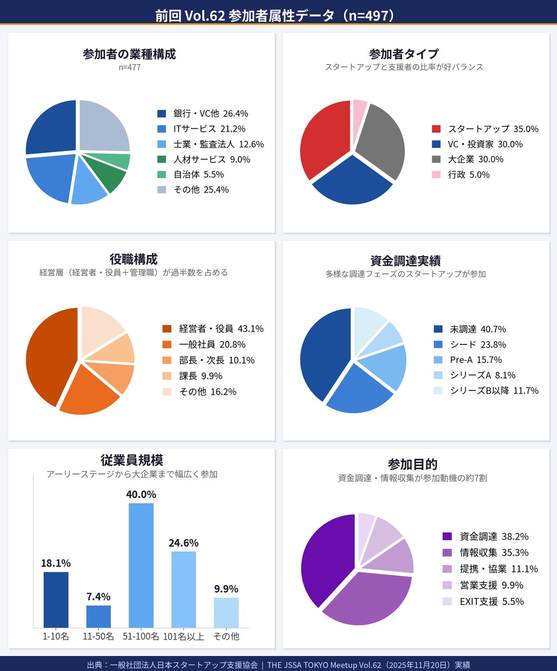参加者の3人に1人が投資家・VCという異例の環境。 来場者の53.2%超が経営者・管理職と「即決できる人」が参加。 資金未調達〜シリーズBまでのスタートアップが参加するので、 同じ悩みを持つ仲間との出会いも生まれ、一日で資金・情報・人脈の三つが手に入るイベント。