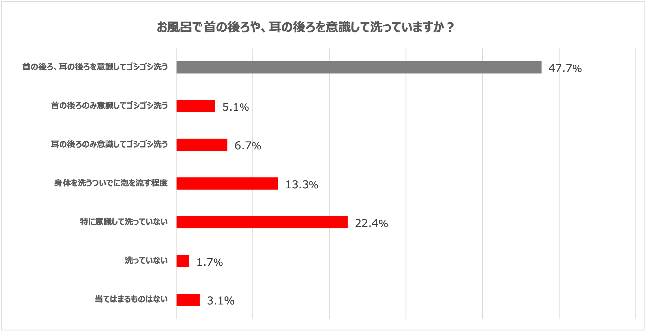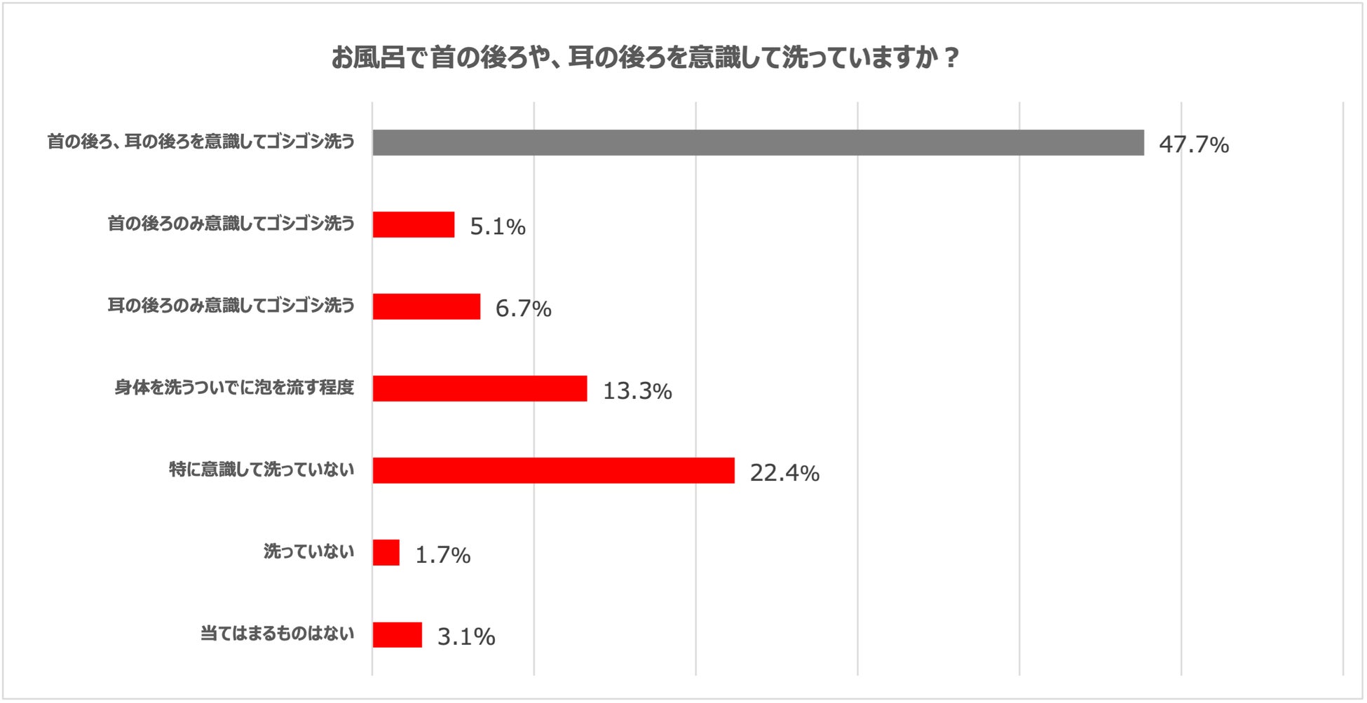 本調査で、「お風呂で首の後ろや、耳の後ろを意識して洗えているか」を調査した結果、全体の約半数の方は、首・耳の後ろ両方を意識して洗えていない、という結果が分かりました。ダニ対策と直接関係がないように思われますが、首や耳の後ろから出る分泌物「ノナナール」や「パルミチン酸」にチリダニ類が誘引され枕周辺に集まりフンをします。そのため、「首・耳の後ろ」を意識して洗うこともダニ対策として有効です。