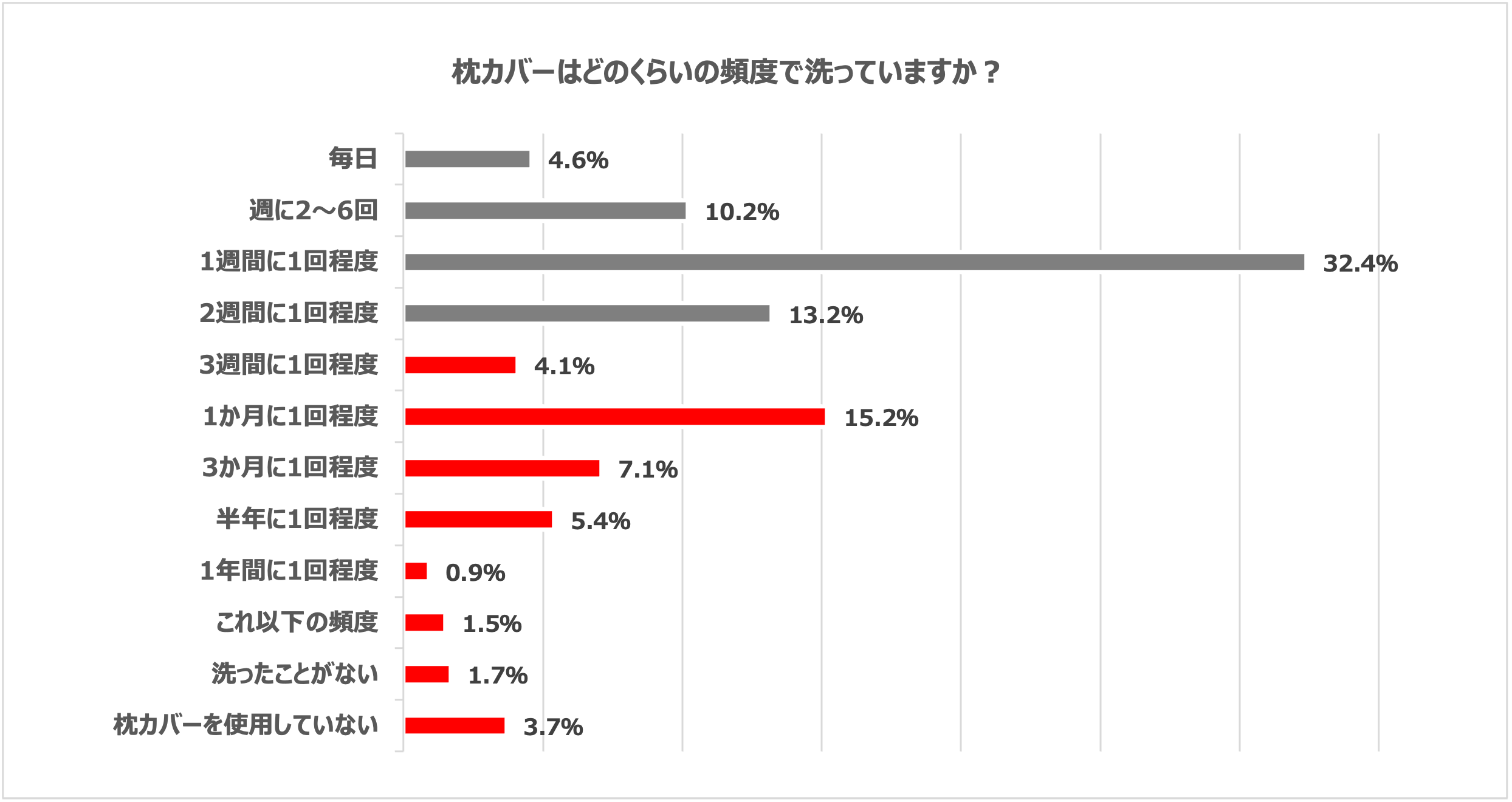 調査の結果、3週間以上枕カバーを洗濯していない“ダニまくら”で寝ている可能性の高い人が全体の約4割もいることが判明しました。中でも、枕カバーの洗濯頻度が1か月に1回程度の割合が全体の2位(15.2%)という結果となり、枕カバーを毎日や毎週の洗濯ルーティンとしている方と、まったく気にしていない方と両極端であることが判明しました。