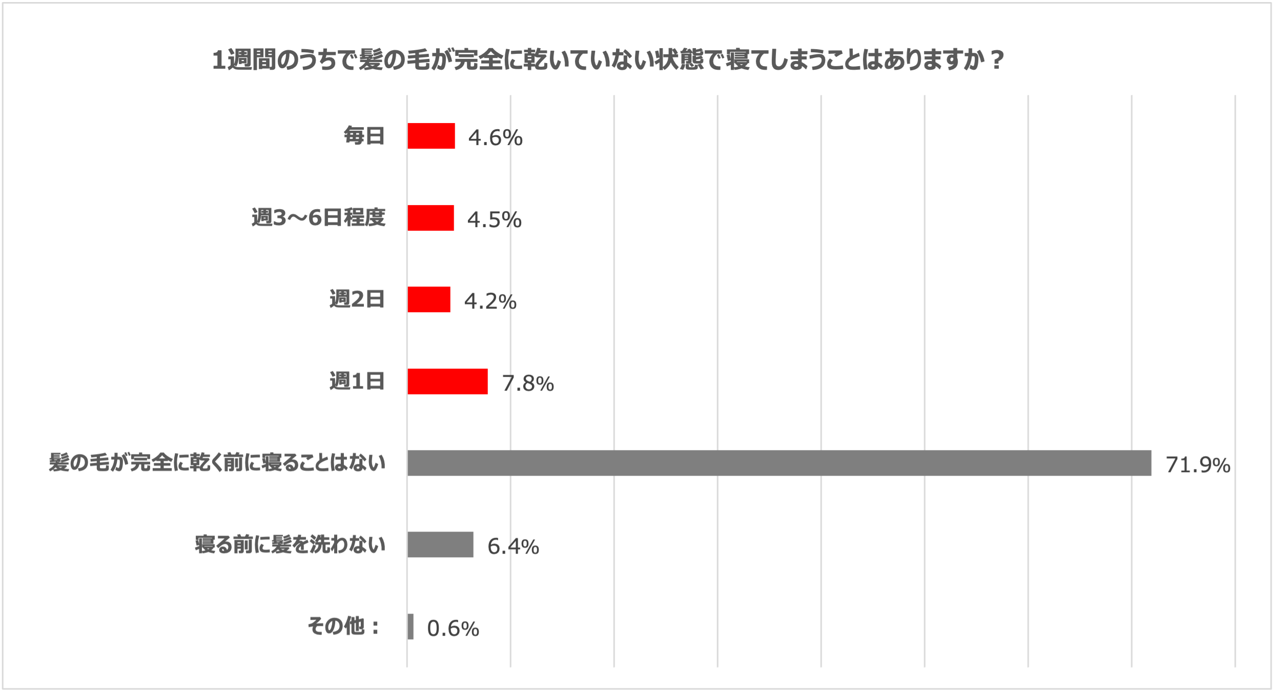 髪の毛が濡れたまま寝てしまうと、枕の「湿度」が高くなり、ダニが繁殖しやすくなる傾向にあることから、就寝時の髪の毛の状態について調査したところ、全体の約2割の方が週に1回以上は濡れたまま寝てしまっているという結果が分かりました。