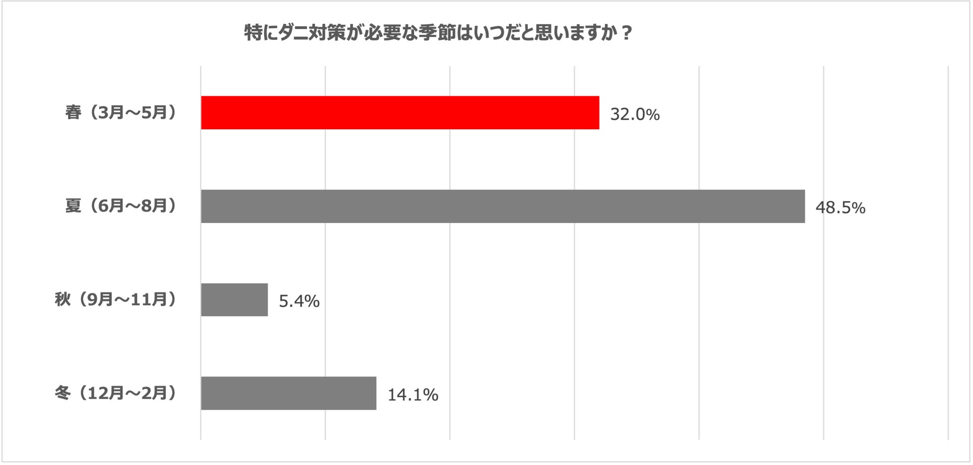 「特にダニ対策が必要な季節はいつだと思いますか」の質問に対し、全体の約半数の方が「夏」と回答。しかし、春はすでにダニの繁殖が始まるシーズンとなるため、「春」のダニ対策は非常に重要です。理由としては、春は厳しい冬に生き残った成虫が産んだ卵の孵化と、花粉シーズンで増える室内干しによる部屋のジメジメが重なり、ダニの活動が活発化するためです。また、春にダニの数を減らすことで、夏に増えるダニの数も減らすことができます。そこで当社は、桜前線のように桜が咲き始める3月頃にやってくることから、その様子を『ダニ前線』と名付け、啓蒙しております。