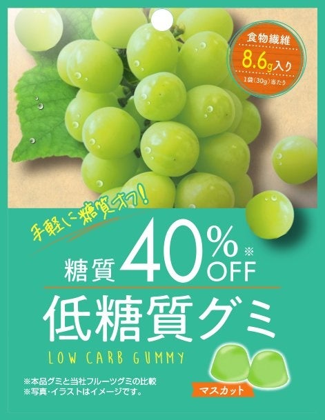 商品特徴:”糖質を気にせずグミを食べたい”という方にぴったりなマスカット味のグミです。パッケージは環境に配慮したバイオマスインキと紙包材を使用。グミ特有の弾力と美味しさはそのままに糖質を40%オフ(※1)しました。