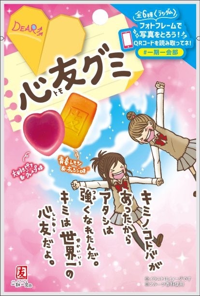 商品特徴:2000年代後半に当時の女子学生から人気を博した「一期一会」とのコラボお菓子。パッケージを読み取って遊べるARフォトフレームのほか、デザインが異なる多彩なパッケージ、手紙のように名前を書いて渡せるなど楽しい仕掛けを詰め込みました。「♡」型ジュレ入りピーチ&グレープ味と「友」型レモン&オレンジ味の2種ミックス。