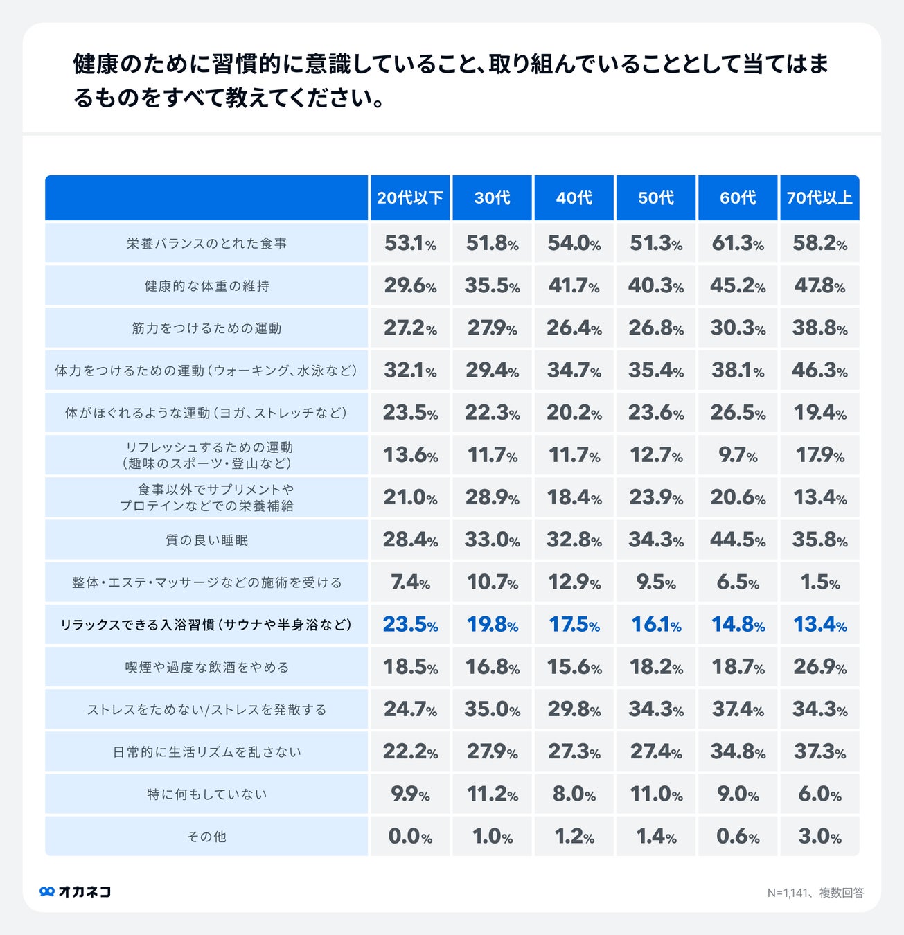 年代別に回答結果を比較すると、「リラックスできる入浴習慣(サウナや半身浴など)」を意識している方が20代以下23.5%、30代、19.8%、40代17.5%、50代16.1%、60代14.8%、70代13.4%と、若い世代ほど入浴習慣への意識が高いことが分かりました。