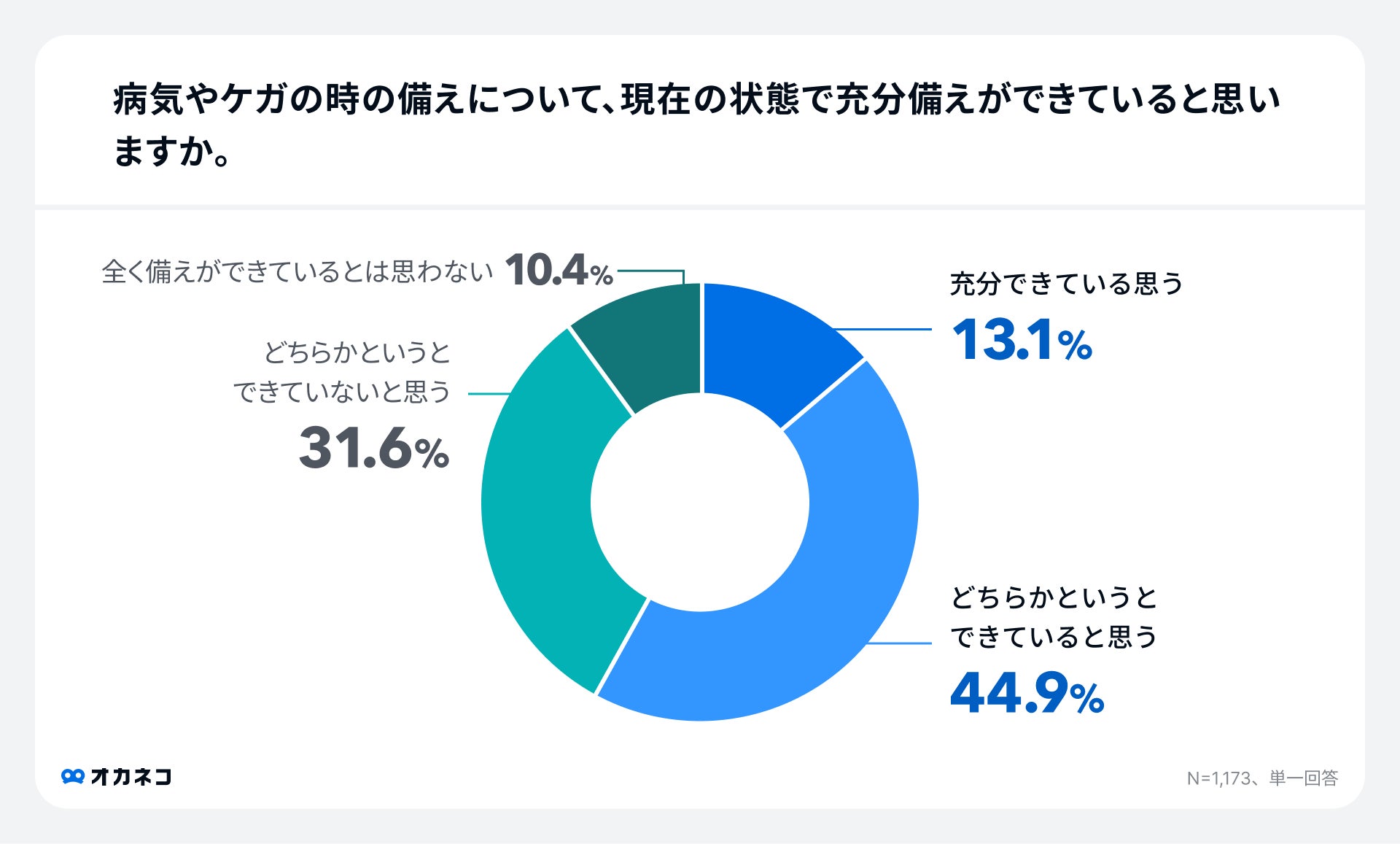 「病気やケガの時の備えについて、現在の状態で充分備えができていると思いますか。」という質問に対し、「充分できていると思う」13.1%、「どちらかというとできていると思う」44.8%、「どちらかというとできていないと思う」31.6%、「全く備えができているとは思わない」10.4%という結果になりました。4割がいざという時の備えに不安があることが分かりました。
