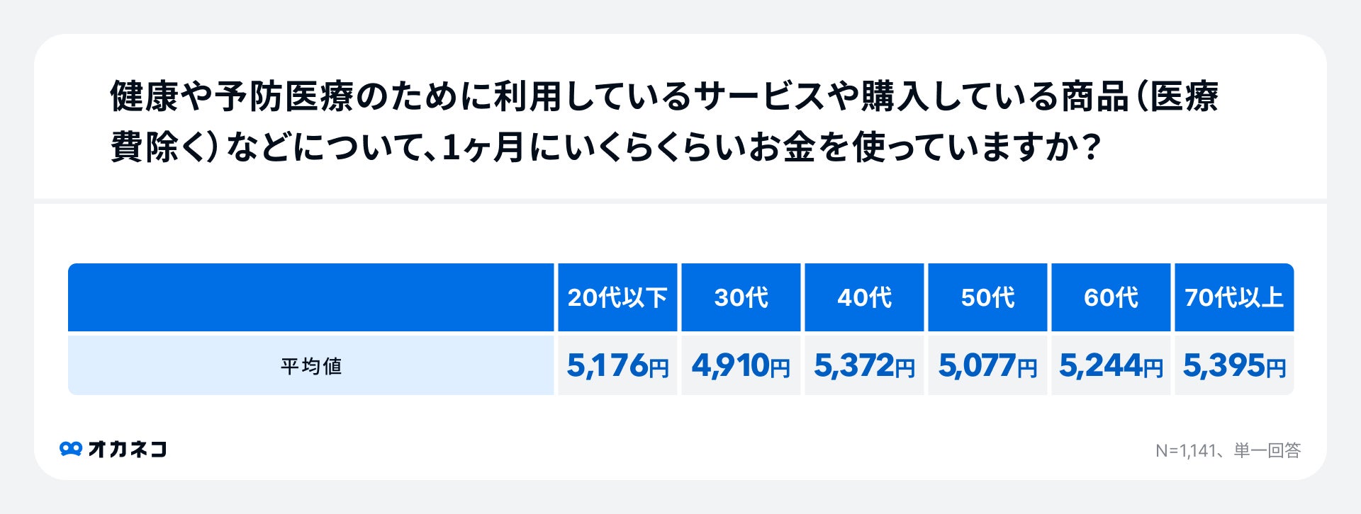 各年代それぞれの平均値は20代以下約5,176円、30代約4,910円、40代約5,372円、50代約5,077円、60代約5,244円、70代以上約5,395円と、年代での差はほとんどありませんでした。