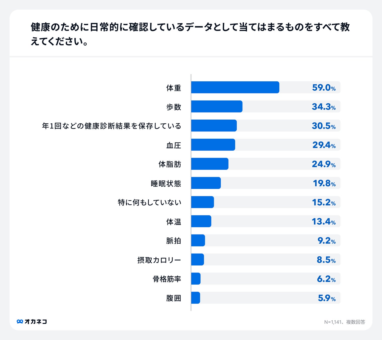 健康について意識していると回答した方への「健康のために日常的に確認しているデータとして当てはまるものをすべて教えてください。」という質問に対し、多かった回答から順に「体重」59.0%、「歩数」34.3%、「年1回などの健康診断結果を保存している」30.5%、「血圧」29.4%という結果になりました。
