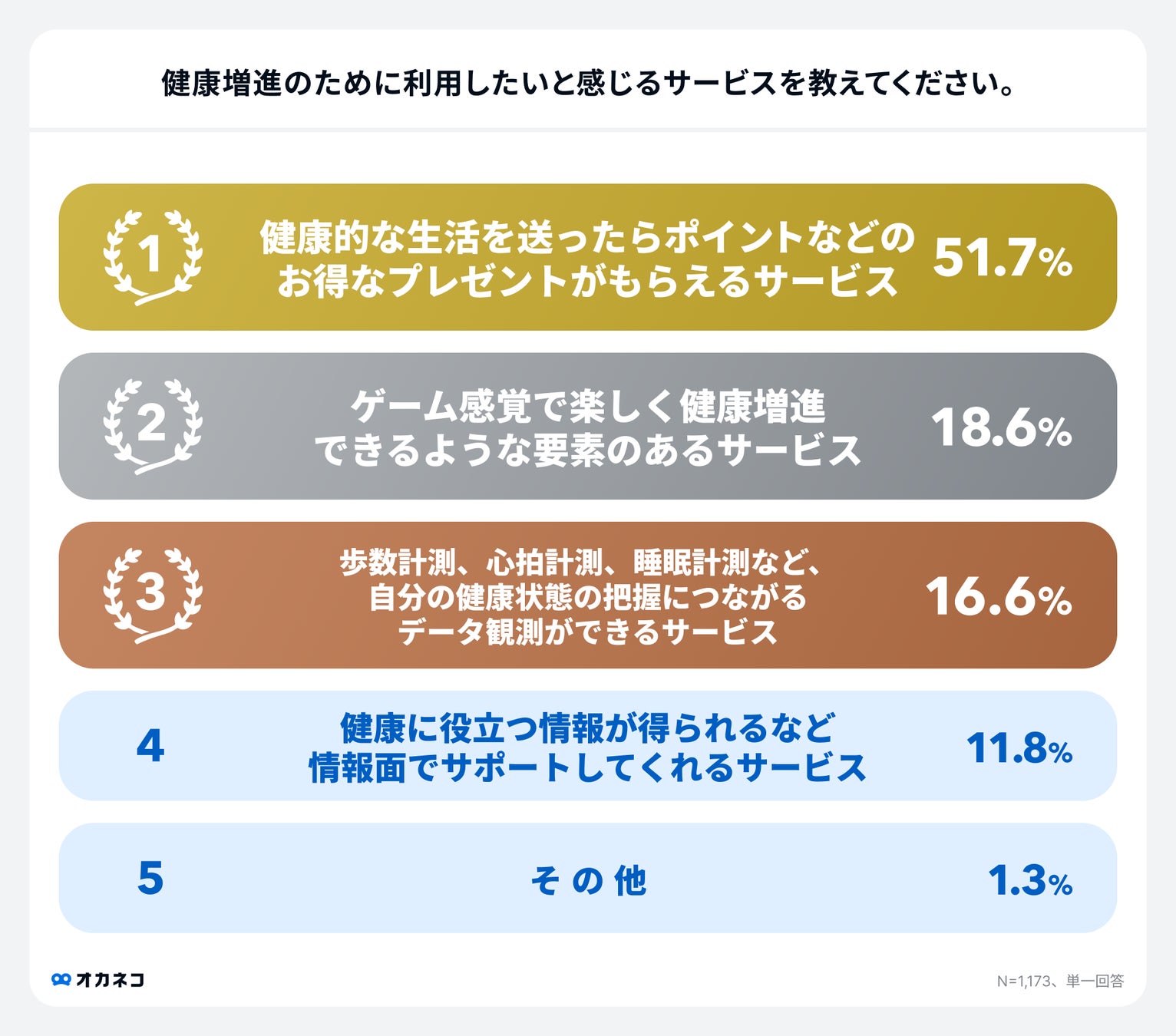 「健康増進のために利用したいと感じるサービスを教えてください。」という質問に対し最も多かったのは「健康的な生活を送ったらポイントなどのお得なプレゼントがもらえるサービス」51.7%と、2位以下と大差をつけてダントツの1位という結果になりました。次いで「ゲーム感覚で楽しく健康増進できるような要素のあるサービス」18.6%、「歩数計測、心拍計測、睡眠計測など、自分の健康状態の把握につながるデータ観測ができるサービス」16.6%、「健康に役立つ情報が得られるなど情報面でサポートしてくれるサービス」11.8%でした。