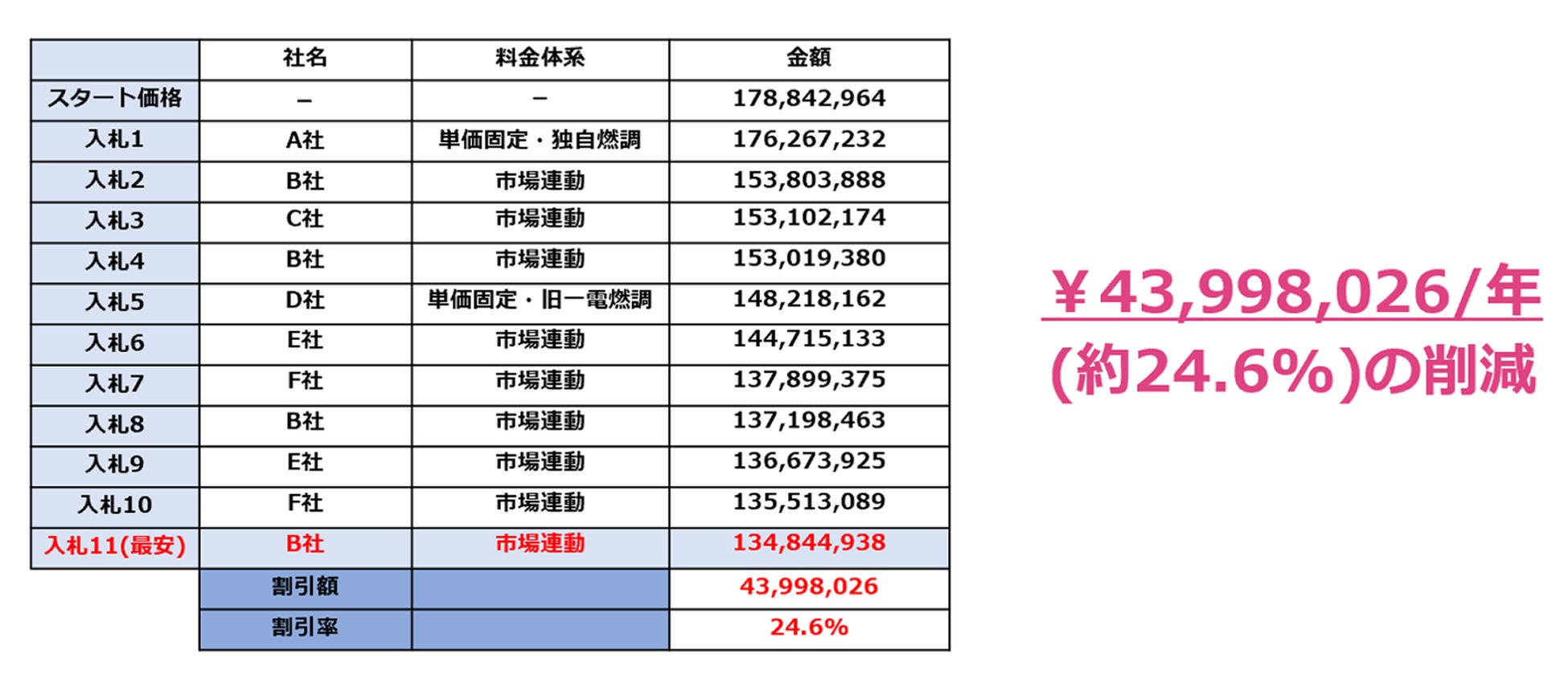 1社1入札が原則の通常の入札とは異なり、リバースオークションを活用することで小売業者が複数回入札でき、安価なCO2フリープランの契約を引き出すことができました。