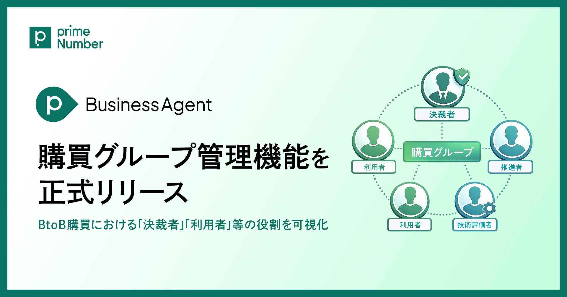 株式会社primeNumber(本社:東京都品川区、代表取締役CEO:田邊 雄樹)は、意思決定支援型AI「primeBusinessAgent」において、AIが行動データから購買関与者を自動でグルーピングし、「決裁者」「利用者」といった個人の役割を可視化する「購買グループ管理」機能を正式リリースします。これによりマーケターや営業は顧客の組織全体の購入意欲を把握した上で「いつ、誰に、どのように」コミュニケーションすべきかを的確に判断し、商談の成功確度を高めることが可能となります。なお、本機能について4月8日から10日に東京ビッグサイトで開催される「Japan IT Week 春 2026」にてご紹介いたします。