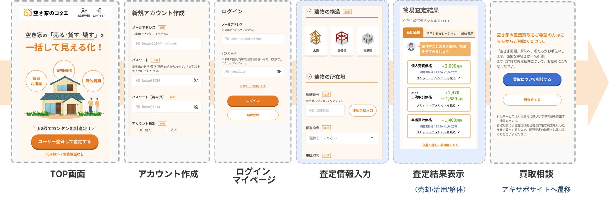 本サービスでは、入力項目を所有者が迷わず回答できる内容に厳選し、手軽さにこだわりました。メールアドレスとパスワードによる簡単なアカウント作成後、ログインすることで利用を開始できます。Web上で物件の所在地や築年数、構造、延床面積などの基本情報を入力するだけで、AIが空き家の価値を多角的に算出いたします。査定結果では、①個人売買価格、②三為取引価格、③業者買取価格の3つの売却パターン※2ごとに想定価格を提示するほか、賃貸・リノベーションによる活用を想定した収益シミュレーション、さらには解体にかかる概算費用までを可視化いたします。