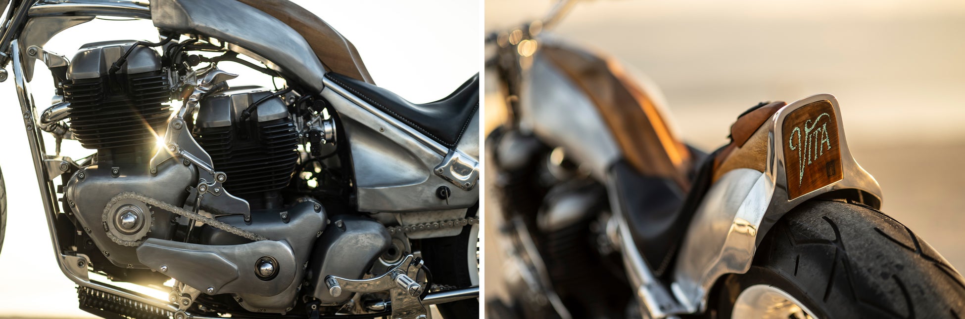 「VITA」最大の特徴は、CLASSIC 650の排気量648cc空冷4ストローク並列2気筒SOHC4バルブエンジンを2基搭載していること。前側エンジンのミッションを取外し、クランクケースを短く加工。前後2つのエンジンを、エンジン左側に配置したプライマリーチェーンによって連結しています。エンジンは、独自設計したハードテール・フレームに搭載。フロントには独自設計したクラシカルなスタイルのガーダーフォークを、26インチというモダンな大径ホイールをセットしました。モダンとクラシックの融合を果たしています。外装にはマホガニー材を使用。それとリンクする外装類は塗装を廃し、アルミの地肌と木目が美しくリンクしています。