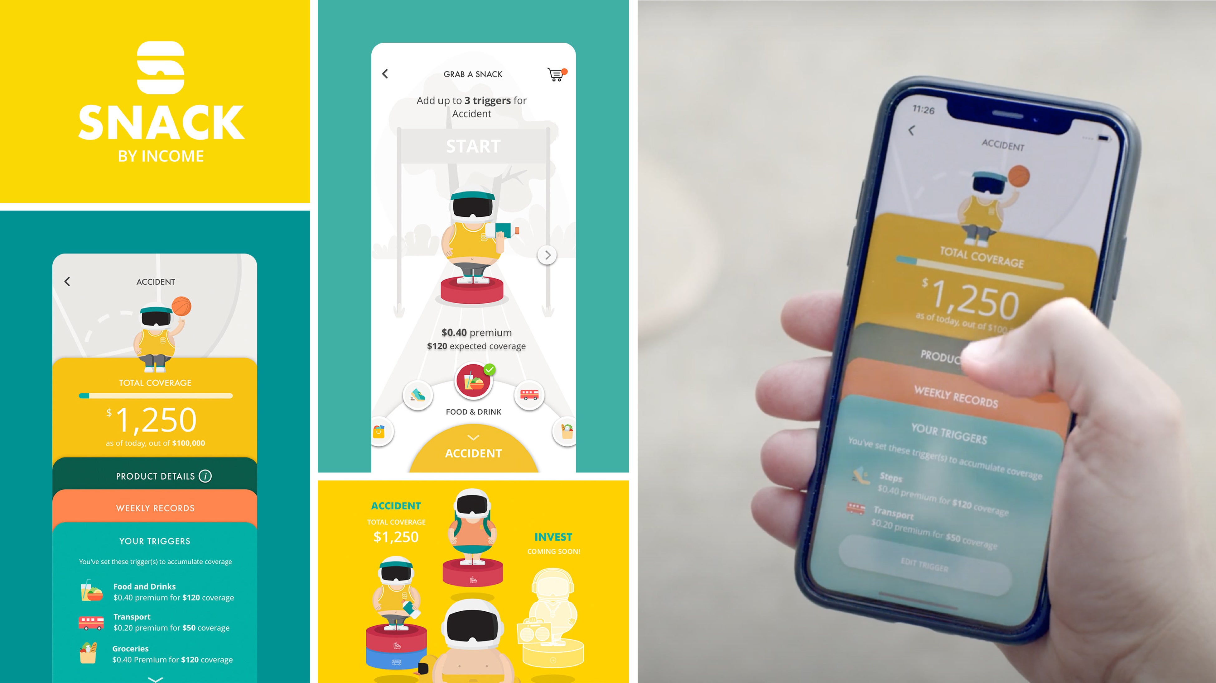 「Income社は1970年に設立された歴史ある保険会社ですが、若年層の顧客獲得に課題がありました。Income社の調査の結果、若年層の保険契約には3つのタイミングがあることがわかりました。1つ目は親が保険を決定するとき、2つ目は自身の給与を得たとき、3つ目は結婚したときです。若年層の顧客獲得のためには、これらのステップより早い段階で保険について考える仕組みが必要でした。そこでIncome社とモンスターラボは保険商品を若年層のライフスタイルに取り込むプラットフォームとして『SNACK』を開発しました。SNACKはアプリを通じて、日常生活の活動にパーソナライズされた保障を提供します。さらに150社のパートナーとも提携し、リワードやキャッシュバックを受け取れるアプリのデザインによって、保険に対するタッチポイントを若年層の日常生活に組み込むようにしています。