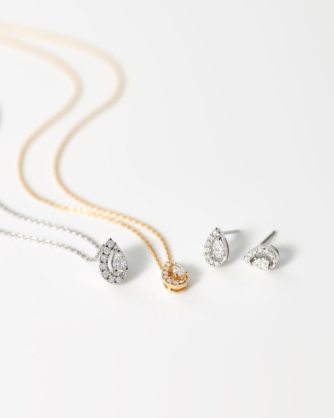 透明感のある煌めきを放つペアシェイプカットダイヤモンドを、繊細なメレダイヤモンドで包み込んだ、潤い溢れる輝きが魅力の「ダイヤモンドグゥット」シリーズ。定番のティアドロップ型を中心から少しずらすことで美しい躍動感が生まれ、一段高くセッティングされた大きなペアシェイプカットのダイヤモンドと、その周りを包む繊細なメレダイヤモンドが奏でるハーモニーとコントラストは、ベーシックで正統感ある雫のモチーフにモダンな印象をプラスします。