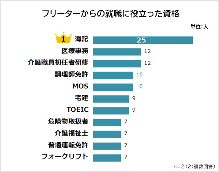 フリーターから資格を活かして就職した経験がある212人に「就職に役立った資格は?」と聞いたところ、回答は以下のようになりました。