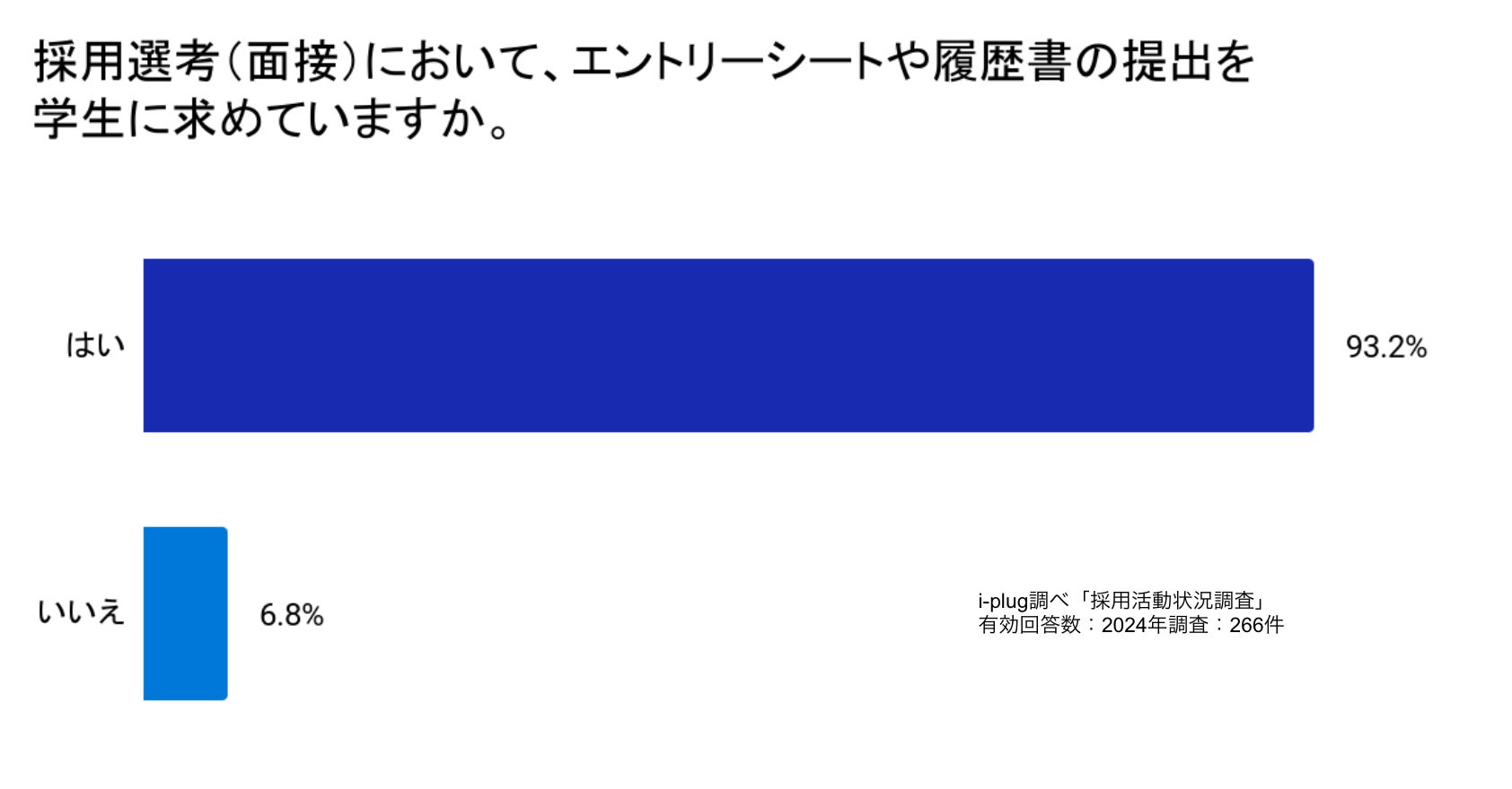 採用選考(面接)において、エントリーシートや履歴書の提出を学生に求めている企業は93.2%でした。