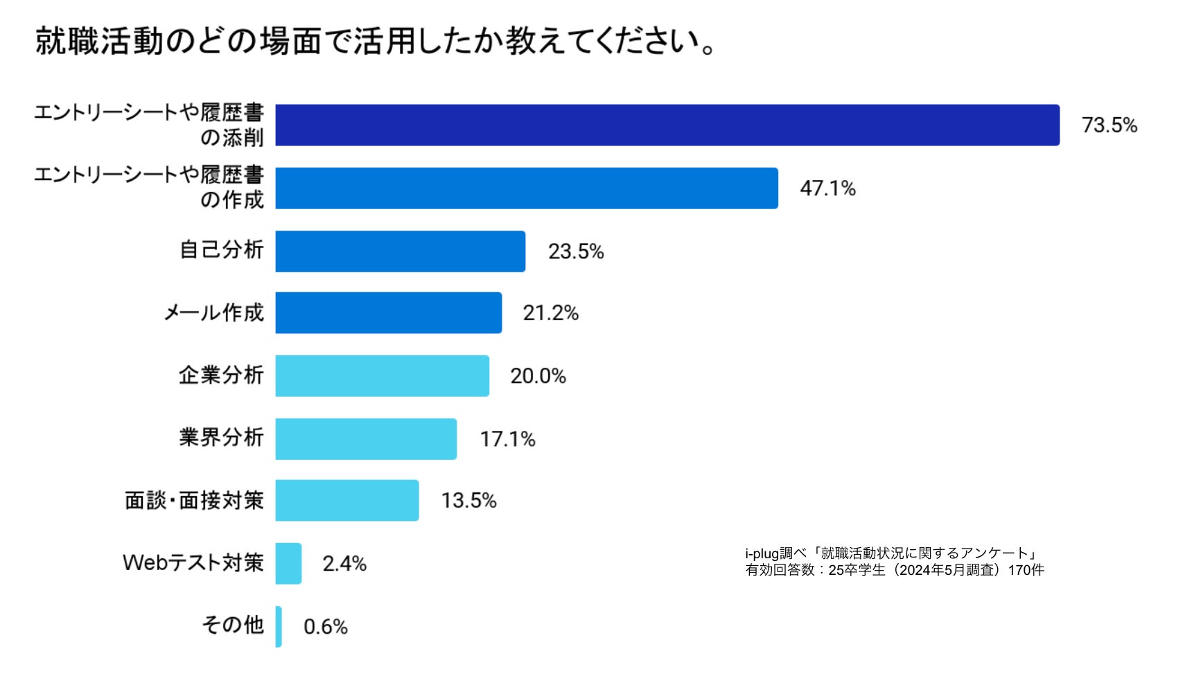 「エントリーシートの履歴書の添削」が最多の73.5%でした。次いで「エントリーシートや履歴書の作成」が47.1%。エントリーシートや履歴書で活用する学生が多いことがわかります。